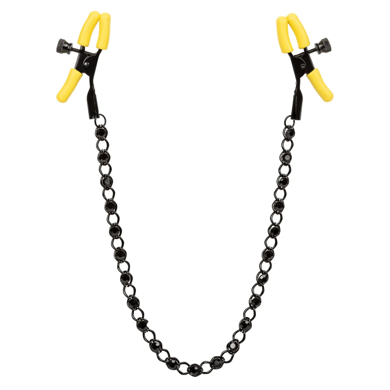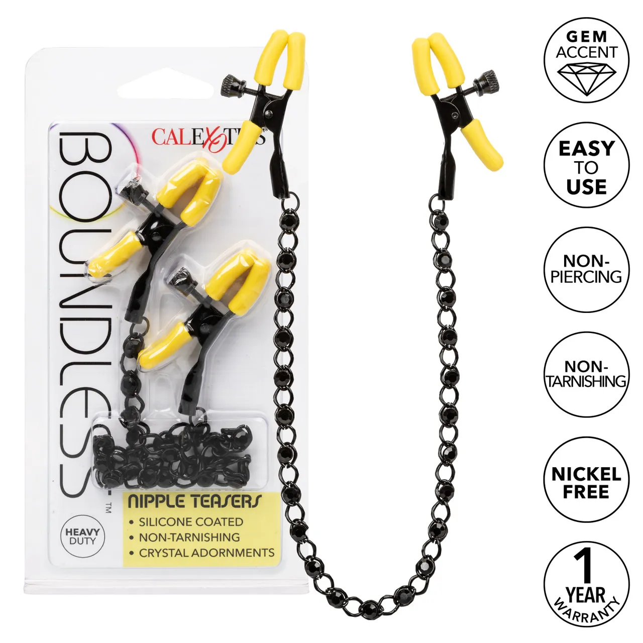 BOUNDLESS NIPPLE TEASERS - регулируемые зажимы на соски в виде прищепок с цепочкой, в звеньях которой вставлены черные кристаллы. Они изготовлены из не содержащего никеля железа. Кончики зажимов оснащены мягкими, удобными подушечками из силикона.