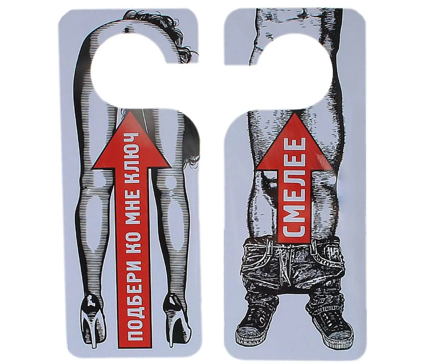 Сувенир от российского производителя Сима Ленд сделан из пластика, украшен рисунком обнаженной женщины с характерной надписью «Подбери ко мне ключ» и изображением мужчины со спущенными штанами и призывом «Смелее». Табличка станет отличным подарком человеку с хорошим чувством юмора и может использоваться как на дверной ручке дома, так и на работе. Подарите такую табличку своим друзьям или коллегам, которые любят шутить и веселиться, они будут часто пользоваться Вашим подарком.