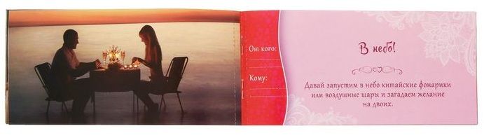 Этот набор создан для самых романтичных натур и тех, кому хочется добавить нежность в отношения. Горячие купоны «Романтика для двоих» станут новым источником романтического вдохновения. А вы подарите друг другу волнующие и прекрасные часы вместе, как на первом свидании!