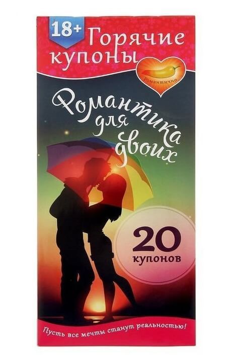 В наборе вы найдёте 20 купонов, которые помогут вам пробудить романтику в отношениях. Выбирайте отрывной купон с желанием и дарите его любимому человеку. Окунитесь в любовь с головой!