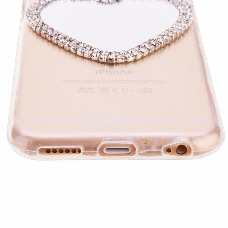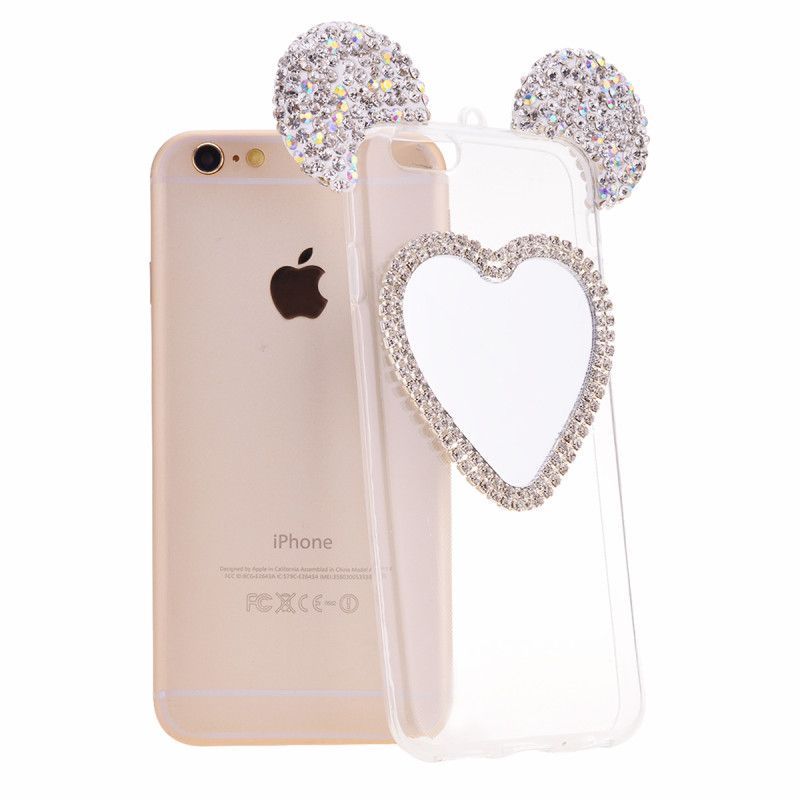 Очень милый чехол для iPhone 6/6S украсит собой Ваш телефон, буквально превратив его в сияющую драгоценность. Ушки мышки с переливающимися стразами будут ярко сверкать на свету, привлекая внимание. Сзади на чехле есть зеркальце в виде сердечка, также украшенное стразами, в которое в любой момент можно будет посмотреться, чтобы проверить макияж или просто полюбоваться собой.