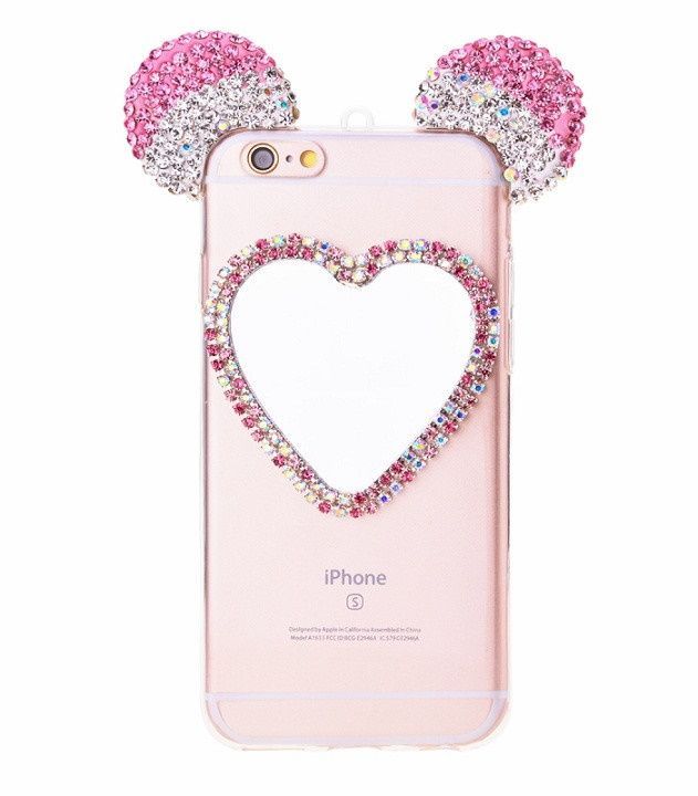 Очень милый чехол для iPhone 6/6S украсит собой Ваш телефон, буквально превратив его в сияющую драгоценность. Ушки мышки с переливающимися стразами будут ярко сверкать на свету, привлекая внимание. Сзади на чехле есть зеркальце в виде сердечка, также украшенное стразами, в которое в любой момент можно будет посмотреться, чтобы проверить макияж или просто полюбоваться собой.
