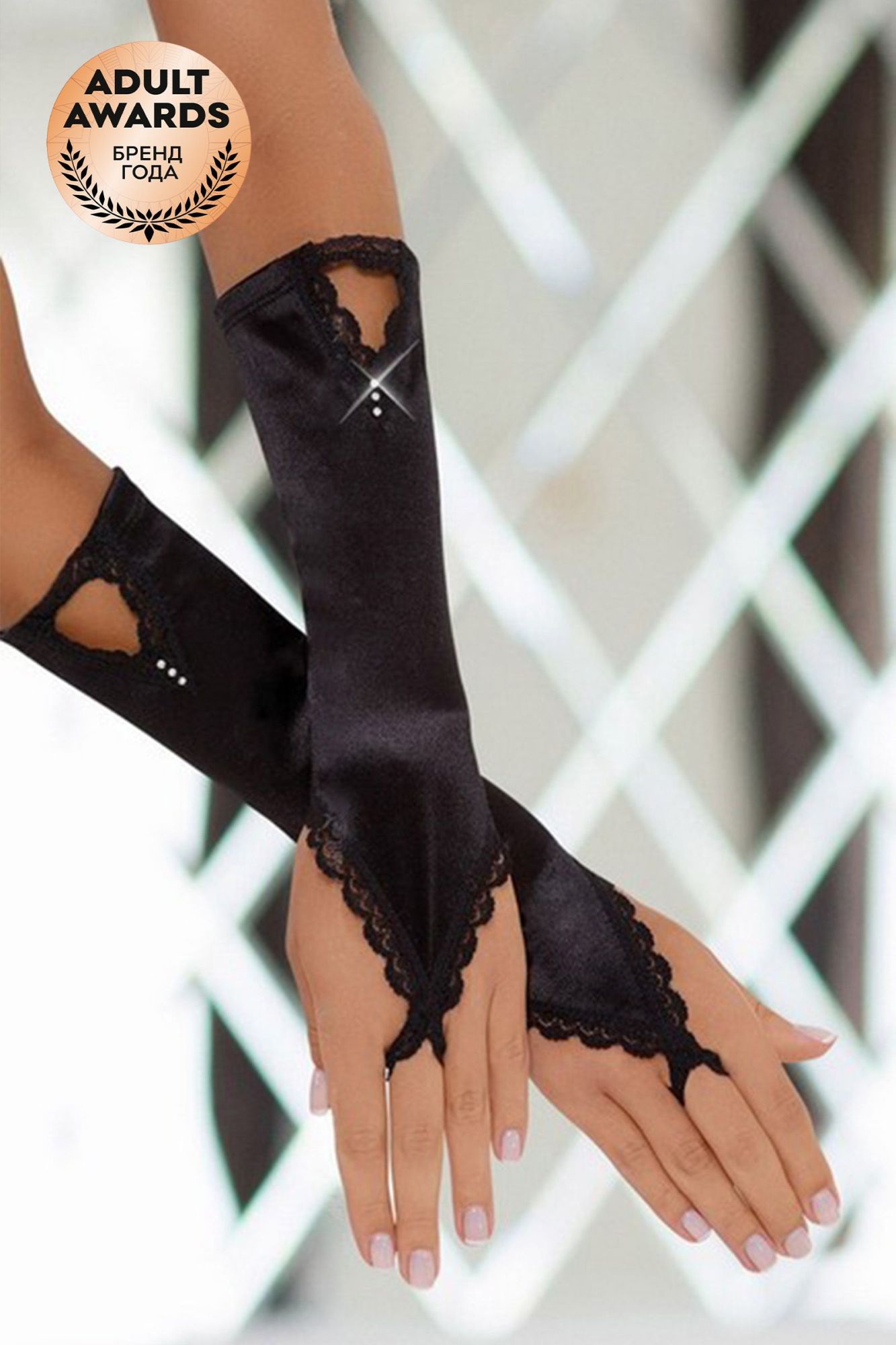 Перчатки атласные, украшенные стразами и кружевными элементами декора. Вырезы в виде треугольников у основания.
