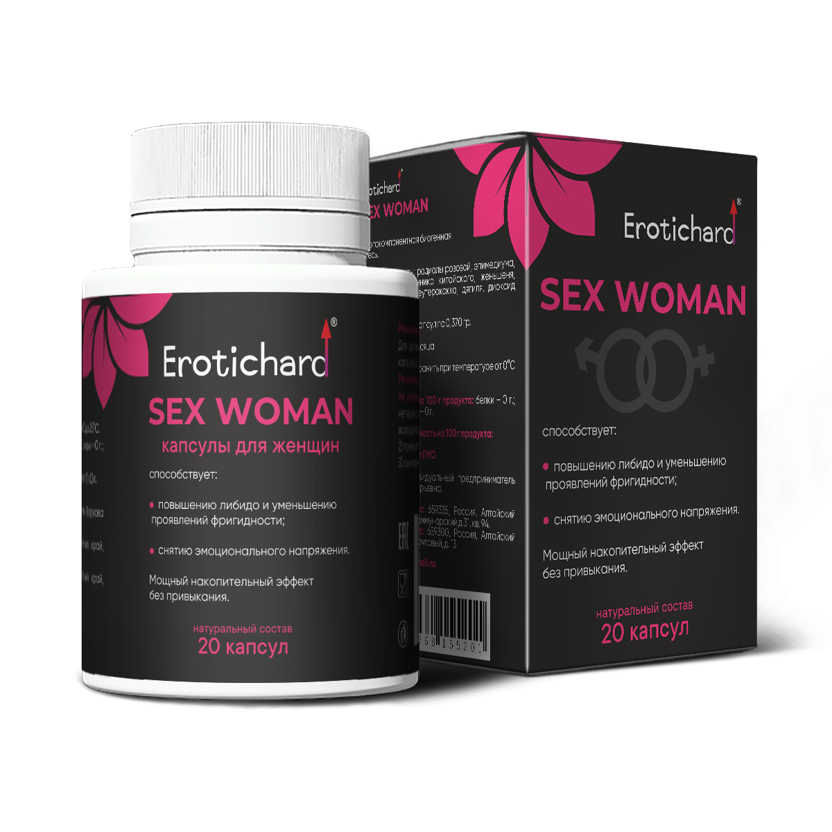 Биогенный комплекс растительных экстрактов для женщин Erotichard® sex women в капсулах, это возбуждающее средство растительного происхождения для женщин. Капсулы способствуют повышению либидо, увеличению сексуальной активности, обострению чувственных ощущений во время близости, улучшению состояния при хронической усталости, депрессии, нервном истощении и перенапряжении, уменьшению симптомов ПМС и менопаузы. Состав экстракты: родиолы розовой, эпимедиума, кордицепса, лимонника китайского, женьшеня, пальмы Сабаль, элеутерококка, дягиля, диоксид кремния (Е551). Эффект наступает через 40 минут-1,5 часа. Для достижения максимальной эффективности необходим курсовой прием. Продолжительноссть приема 14 дней.