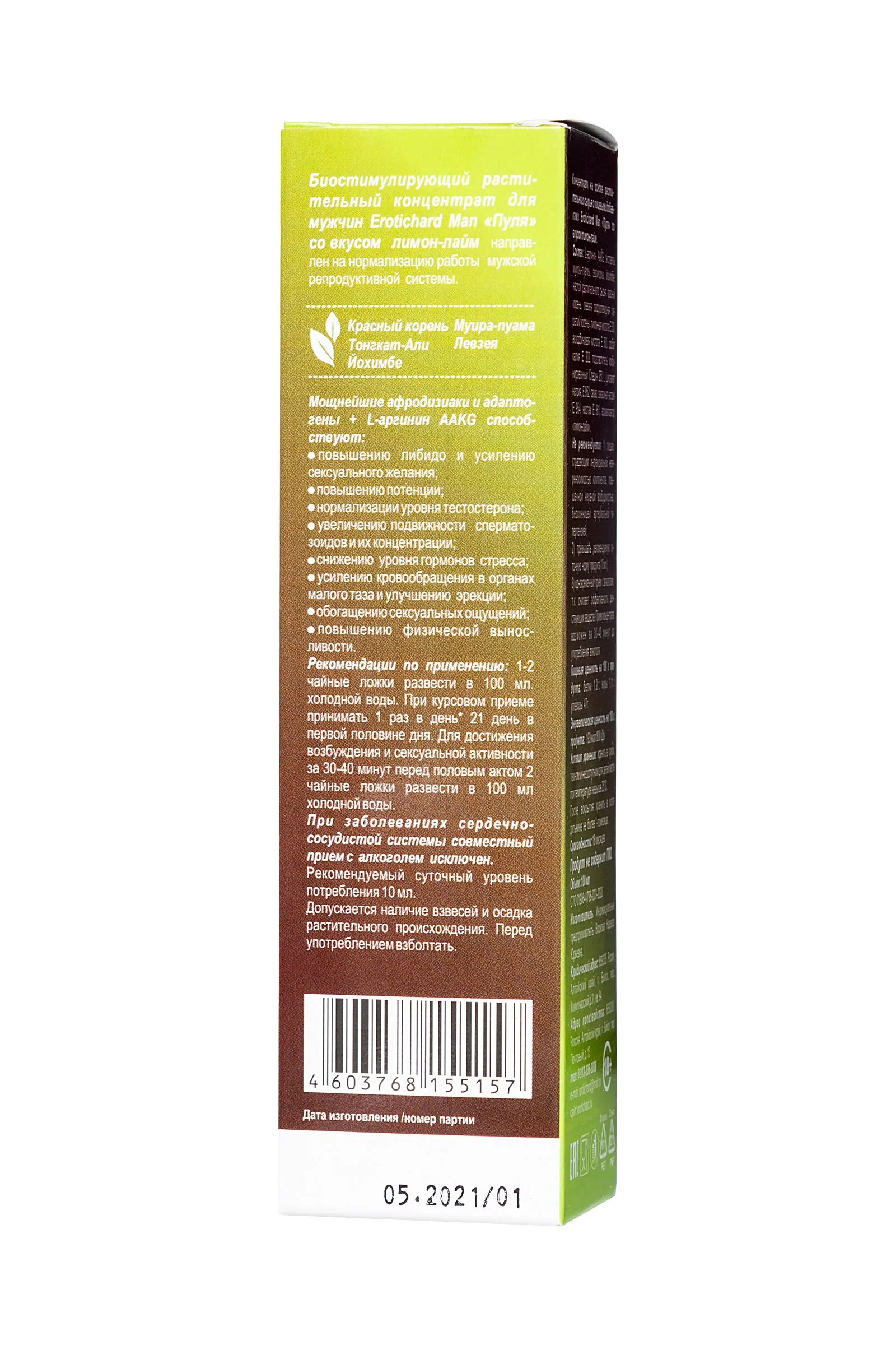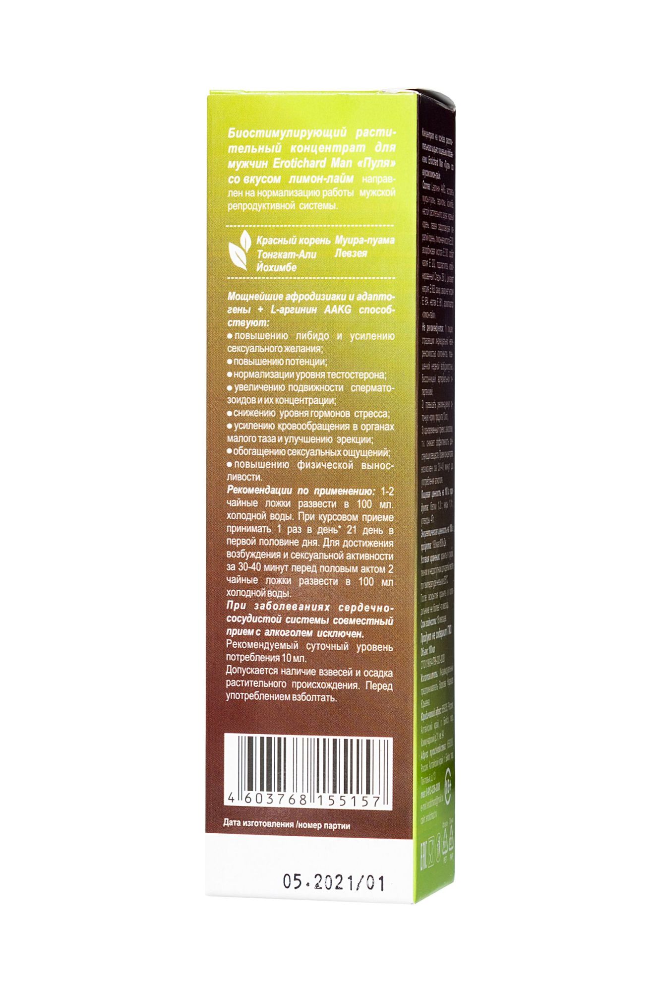 Для мужчин важно оставаться сексуально активными, здоровыми и выносливыми в любом возрасте. Биостимулирующий растительный жидкий концентрат Erotic hard Man “Пуля” со вкусом виски-кола разработан специально для мужчин. За счет натуральных растительных компонентов в составе, Erotic hard Man “Пуля” оказывает положительный эффект на работу всех основных систем организма. А мощные природные афродизиаки, усиленные L-аргинином AAKG, благотворно воздействуют на половую функцию. Концентрат со вкусом виски-кола не содержит сахара, в его составе натуральный подсластитель “Сладин 250L”, при этом содержание калорий всего 1 Ккал на 100 г. Принимать его полезно для организма, ведь в 10 мл содержится максимально допустимая суточная доза активных компонентов, в отличие от сиропов. Биостимулирующий растительный жидкий концентрат для мужчин “Erotic hard” Man “Пуля” продлевают эрекцию; усиливает потенцию и сексуальные ощущения; стимулирует подвижность сперматозоидов и улучшает качество спермы; повышает физическую выносливость; нормализует уровень тестостерона; снижает вероятность развития патологических изменений в предстательной железе; способствует укреплению иммунитета; оказывает противовоспалительное и противомикробное действие; улучшает самочувствие, успокаивает и расслабляет нервную систему. Рекомендации по применению: Курсом — принимать внутрь в первой половине дня 2 ч.л. (10 мл), курс приема - 21 день; Единоразово для достижения возбуждения и сексуальной активности перед половым актом — 2 ч.л. (10 мл.) за 30-40 минут до полового акта. Состав: L-аргинин ААКG, экстракты муиры-пуамы, эврикомы, йохимбе, настой растительного сырья: красный корень, левзея сафроловидная (маралий корень), лимонная кислота Е 330, аскорбиновая кислота Е 300, сорбат калия Е 202, подсластитель комбинированный Сладин 250 L (цикламат натрия, Е 952, сахар, сахаринат натрия Е 954, неотам Е 961), ароматизаторы: “кола”, “вишня”. Противопоказания: Не рекомендуется: лицам, страдающим индивидуальной непереносимостью компонентов, повышенной нервной возбудимостью, бессонницей, артериальной гипертензией; превышать рекомендуемую суточную норму продукта (10 мл.); одновременный прием с алкоголем, т.к. снижает эффективность действующих веществ. Прием концентрата возможен за 30-40 минут до употребления алкоголя. При заболеваниях сердечно-сосудистой системы совместный прием с алкоголем исключен. Объем: 100мл Принимайте Биостимулирующий растительный жидкий концентрат Erotic hard Man “Пуля” со вкусом виски-кола, а также с другими вкусами, и будьте здоровы.