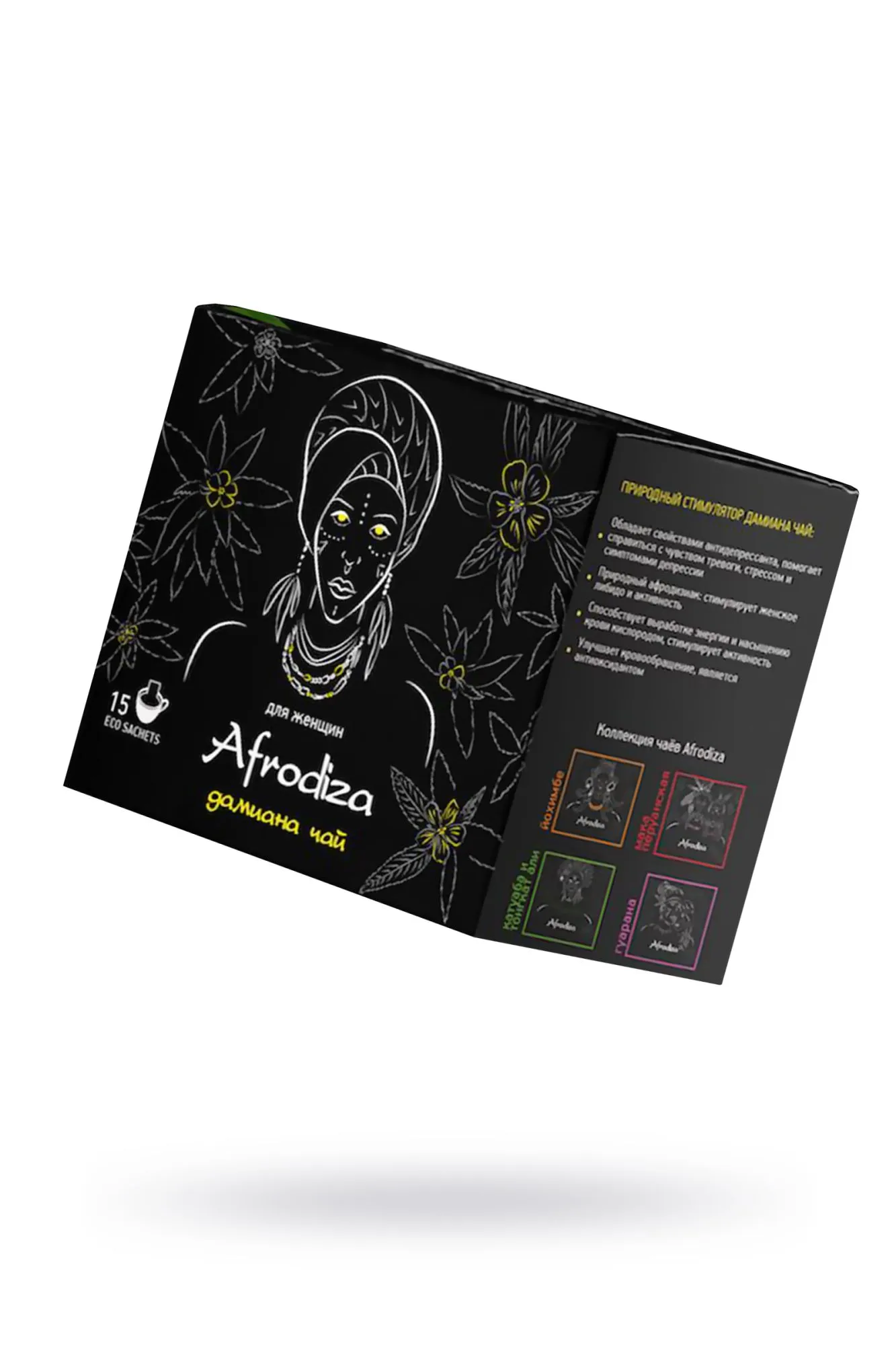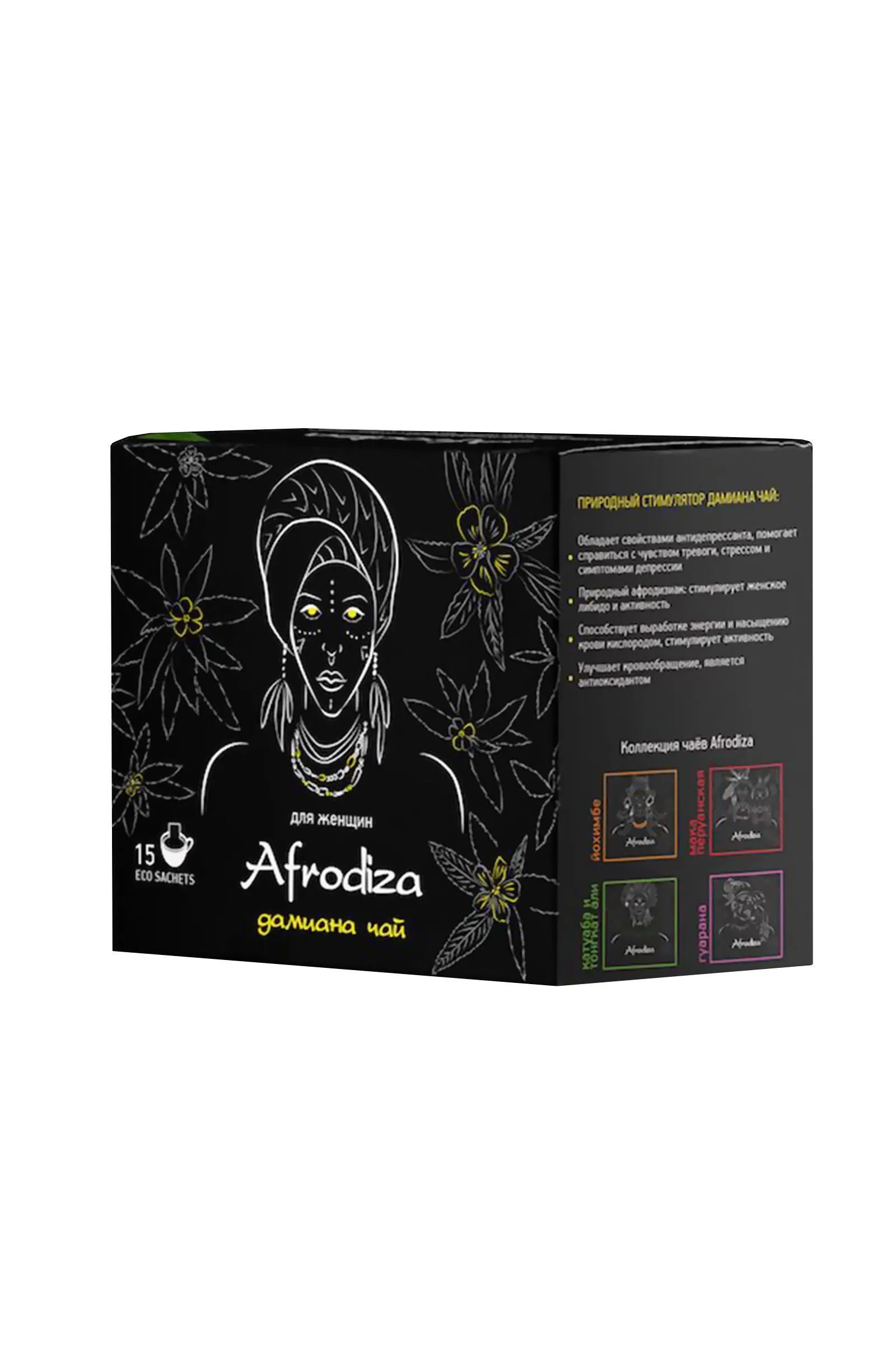 "Индейцы Майя применяли Дамиану в качестве стимулятора и для поддержания общего тонуса. Как афродизиак Дамиана использовалась еще Ацтеками, а позднее в виде компонента любовных составов в магии Вуду. Кроме того, Дамиана — сильный антидепрессант с мягким успокоительным эффектом при эмоциональном дисбалансе. Состав: китайский зеленый чай, молотые листья дамианы, кокосовые хлопья, натуральный ароматизатор кокос. Масса 75 гр. / 15 фильтр-саше по 5 гр."