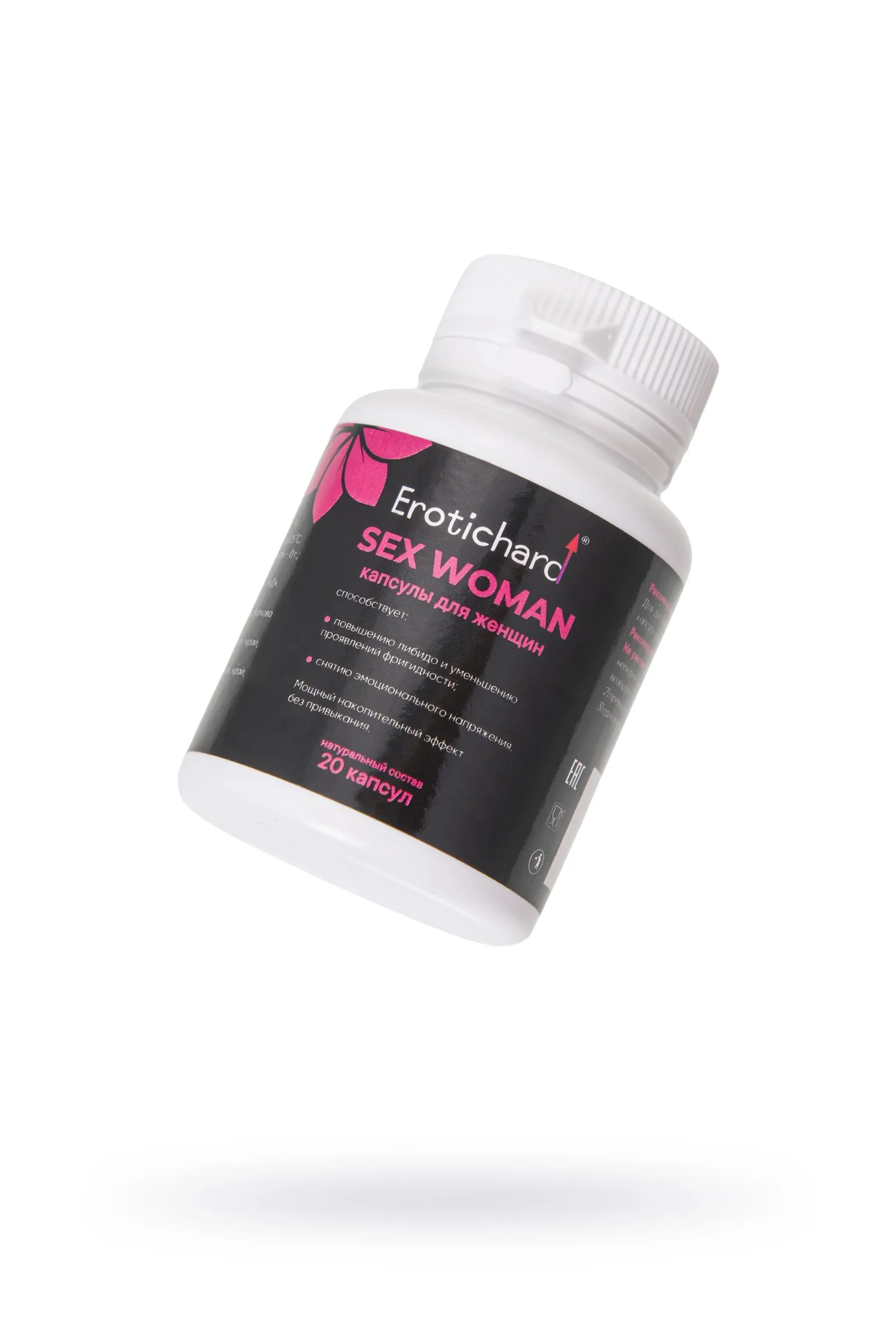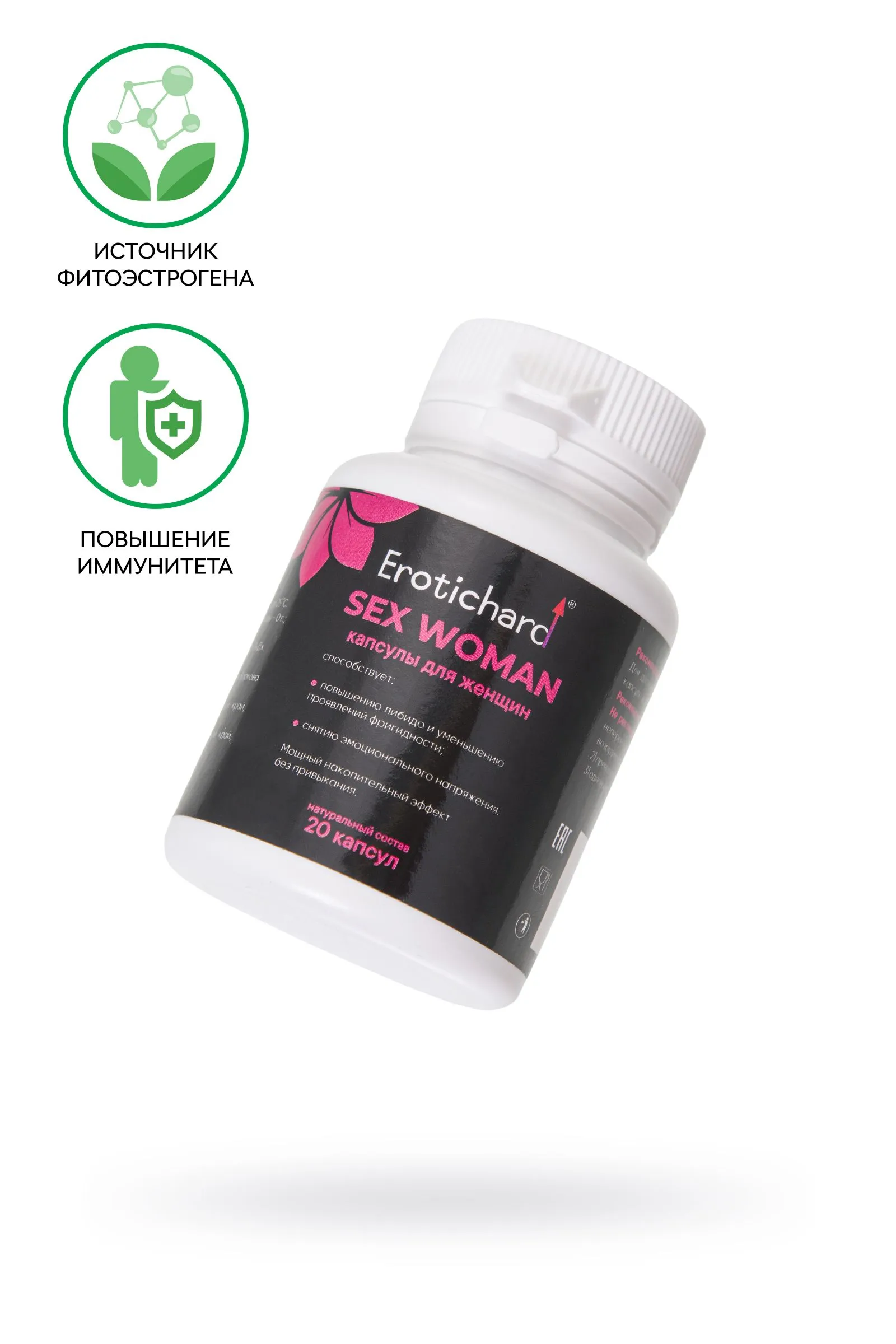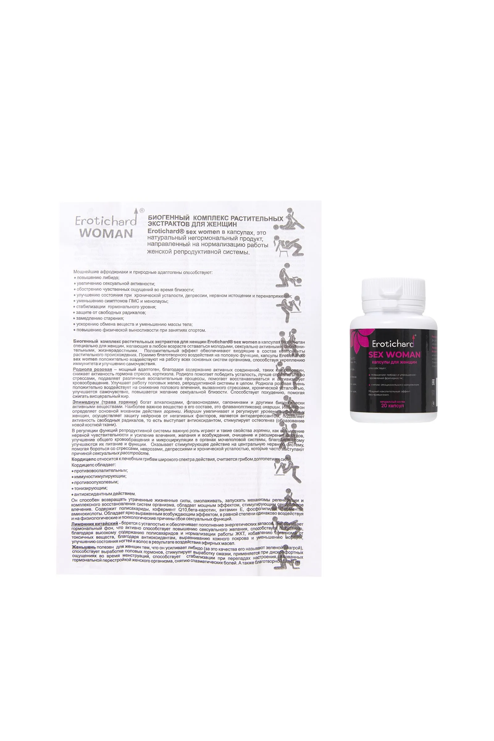 В любом возрасте женщины хотят оставаться сексуально активными, молодыми, соблазнительными и жизнерадостными. Биогенный комплекс растительных экстрактов Erotichard® sex women в капсулах – это возбуждающее средство растительного происхождения для женщин. Природный источник минералов, микроэлементов, антиоксидантов, аминокислот, гликозидов и фитонутриентов. Положительный эффект обеспечивают входящие в состав компоненты растительного происхождения. Капсулы благотворно воздействуют на половую функцию, поддерживают гормональный баланс, увеличивают энергию, выносливость и продлевают молодость. Erotichard® sex women деликатно способствует возбуждению и повышению либидо. Активные компоненты усиливают кровообращение в области органов малого таза. Половые органы и грудь становятся крайне чувствительными, набухают и отзываются повышенной реакцией на прикосновения. Капсулы Erotichard® sex women положительно воздействуют на работу всех основных систем организма, способствуя укреплению иммунитета и улучшению самочувствия. Эффект наступает через 40 минут-1,5 часа. Для достижения максимальной эффективности необходим курсовой прием. Биогенный комплекс растительных экстрактов Erotichard® sex women в капсулах способствует: повышению либидо увеличению сексуальной активности обострению чувственных ощущений во время близости улучшению состояния при хронической усталости, депрессии, нервном истощении и перенапряжении уменьшению симптомов ПМС и менопаузы. Рекомендации по применению: Для достижения возбуждения и сексуальной активности взрослым женщинам принимать по 2 капсулы за 30-40 минут до предполагаемой близости. Профилактический прием: по 1 капсуле в течение 14 дней. Состав: экстракты родиолы розовой, эпимедиума, кордицепса, лимонника китайского, женьшеня, пальмы Сабаль, элеутерококка, дягиля, диоксид кремния (Е551). Противопоказания: не рекомендуется лицам, страдающим индивидуальной непереносимостью компонентов, повышенной нервной возбудимостью, бессонницей, артериальной гипертензией; превышать рекомендуемую суточную норму продукта (2 капсулы); противопоказан одновременный прием с алкоголем, т.к. снижает эффективность действующих веществ. Прием капсул возможен за 30-40 минут до употребления алкоголя. При заболеваниях сердечно-сосудистой системы совместный прием с алкоголем исключен. Форма выпуска: капсулы по 0,370 гр. В упаковке 20 капсул.