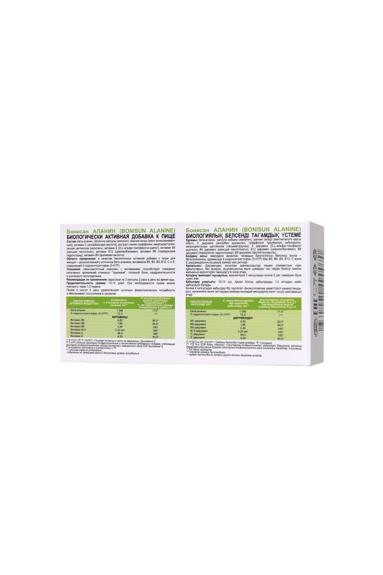 Каждая женщина сталкивается с жизненным этапом, когда менструальный цикл угасает. Бонисан Аланин создан специально для поддержания женского самочувствия и общего уровня энергии в период менопаузы. Активные компоненты аминокислотного комплекса с витаминами Бонисан Аланин способствуют снижению негативных “приливов”, головной боли, раздражительности и усиленного потоотделения. Биологически активная добавка к пище Бонисан Аланин входит в ТОП-10 категории “Климакс (менопауза) негормональные средства. В отличие от других известных препаратов аналогичного действия Бонисан Аланин выпускается в капсулах (в упаковке 60 капсул) и имеет комбинированный состав – источник бета-аланина, витаминов В5, В6, В9, В12, С и Е, содержит 5-гидрокситриптофан (5-НТР). В отличие от фитоэстрогенов бета-аланин обеспечивает быстрое купирование приливов (улучшение наступает в течение 10–30 мин, при тяжелой форме — в течение 2 часов). Метаболиты бета-аланина снижают вероятность приливов и оказывают долговременный эффект. Эффективность Бонисан Аланин наблюдается уже с первых дней приема: количество “приливов” уменьшается, а переносимость – улучшается. нормализуется сон, настроение и аппетит. Тяга к сладкому заметно снижается. эмоциональный фон выравнивается, нервная система успокаивается. профилактика витамина В5, В6, В12 Российское общество акушеров-гинекологов рекомендует применение негормональных растительных и альтернативных средств: цимицифугу кистевидную, бета-аланин и др. для женщин с легкими или умеренными симптомами, которые имеют противопоказания или не хотят использовать менопаузальную гормональную терапию. Рекомендации по применению: Взрослым по 2 капсулы 2 раза в день во время еды. Продолжительность приема: 10-15 дней. При необходимости прием можно повторить через 1-2 недели. Состав: Бета-аланин, оболочка капсулы (желатин (Е441) или гидроксипропилметилцеллюлоза (Е464) с добавлением или без добавления пищевых красителей), магния оксид (Е530, агент антислеживающий), витамин С (аскорбиновая кислота), экстракт семян гриффонии, микрокристаллическая целлюлоза (Е460, носитель), витамин Е (D,L-альфа-токоферола ацетат), витамин В5 (кальция пантотенат), витамин В12 (цианокобаламин), витамин В6 (пиридоксина гидрохлорид), витамин В9 (фолиевая кислота). Противопоказания: Индивидуальная непереносимость компонентов, беременность, кормление грудью. Форма выпуска: капсулы 0,5 г, в упаковке 60 шт. Условия хранения: хранить в сухом месте при температуре не выше 25 °С. БАД, НЕ ЯВЛЯЕТСЯ ЛЕКАРСТВЕННЫМ СРЕДСТВОМ