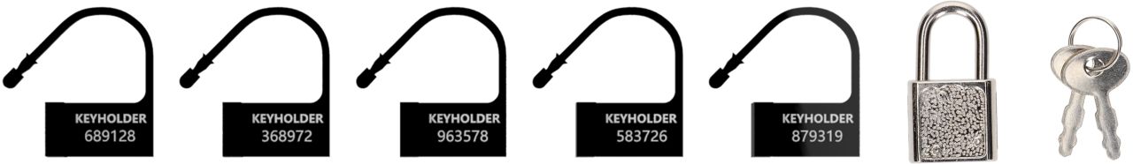 Запасной набор для поясов верности ManCage состоит из 5-ти пластиковых одноразовых замочков и металлического замка с набором ключей.