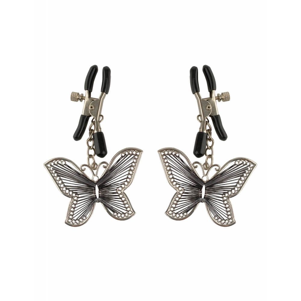 Зажимы для сосков с подвесками в виде бабочки Butterfly Nipple Clamps выпускаются компанией Pipedream в серии Fetish Fantasy. Они выглядят очень изящно и подойдут новичкам. Металлические зажимы покрыты мягкой резиной в местах соприкосновения с нежной кожей сосков, поэтому они не оставляют ранок и повреждений. Партнер будет в восторге, увидев на вас такое необычное украшение.