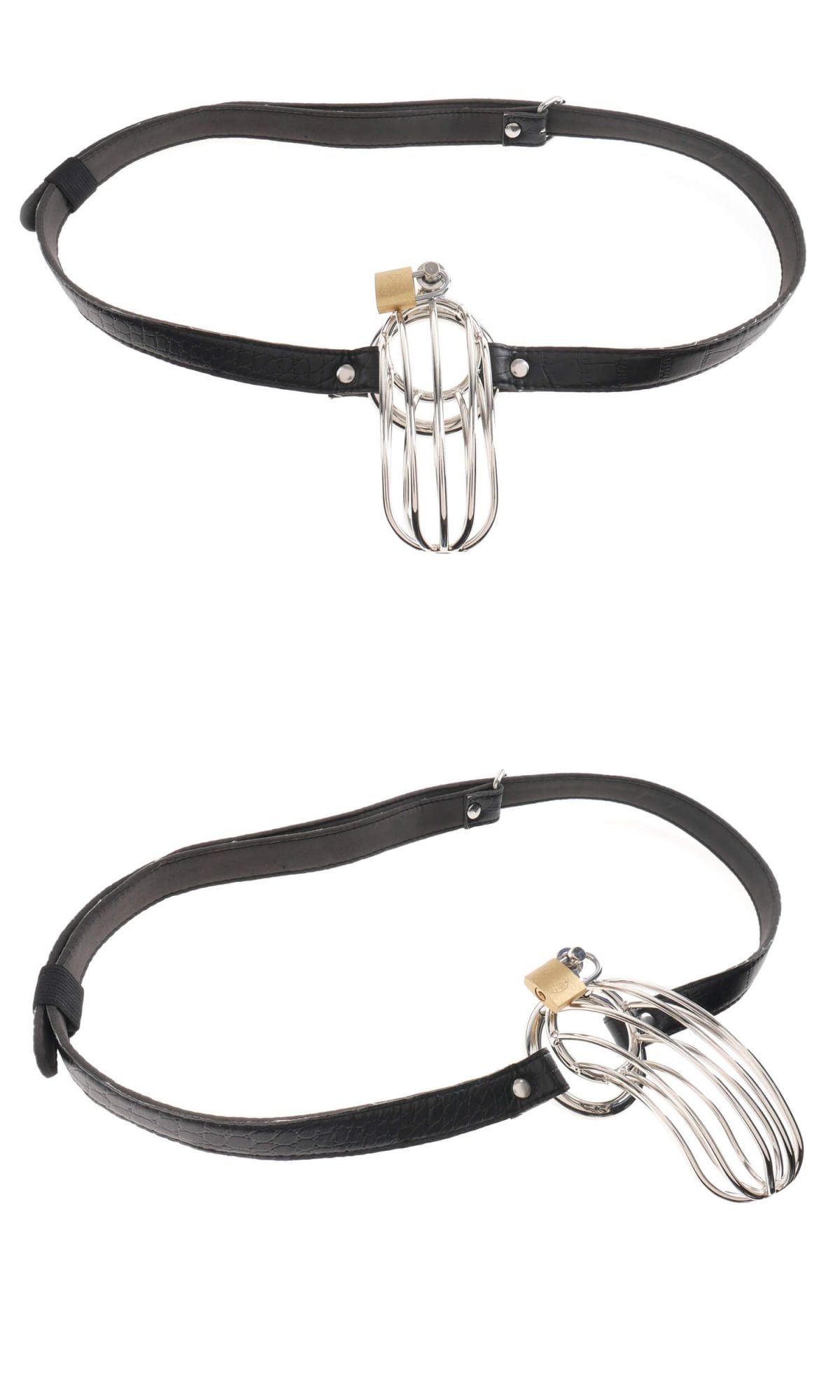 Клетка пояса верности сделана из стали, а черный ремешок из винила с принтом под крокодила. Ремень регулируется под нужный размер. Надевать клетку следует на неэрегированный член и использовать при этом лубрикант. Благодаря отверстиям будет возможность для соблюдения гигиены.