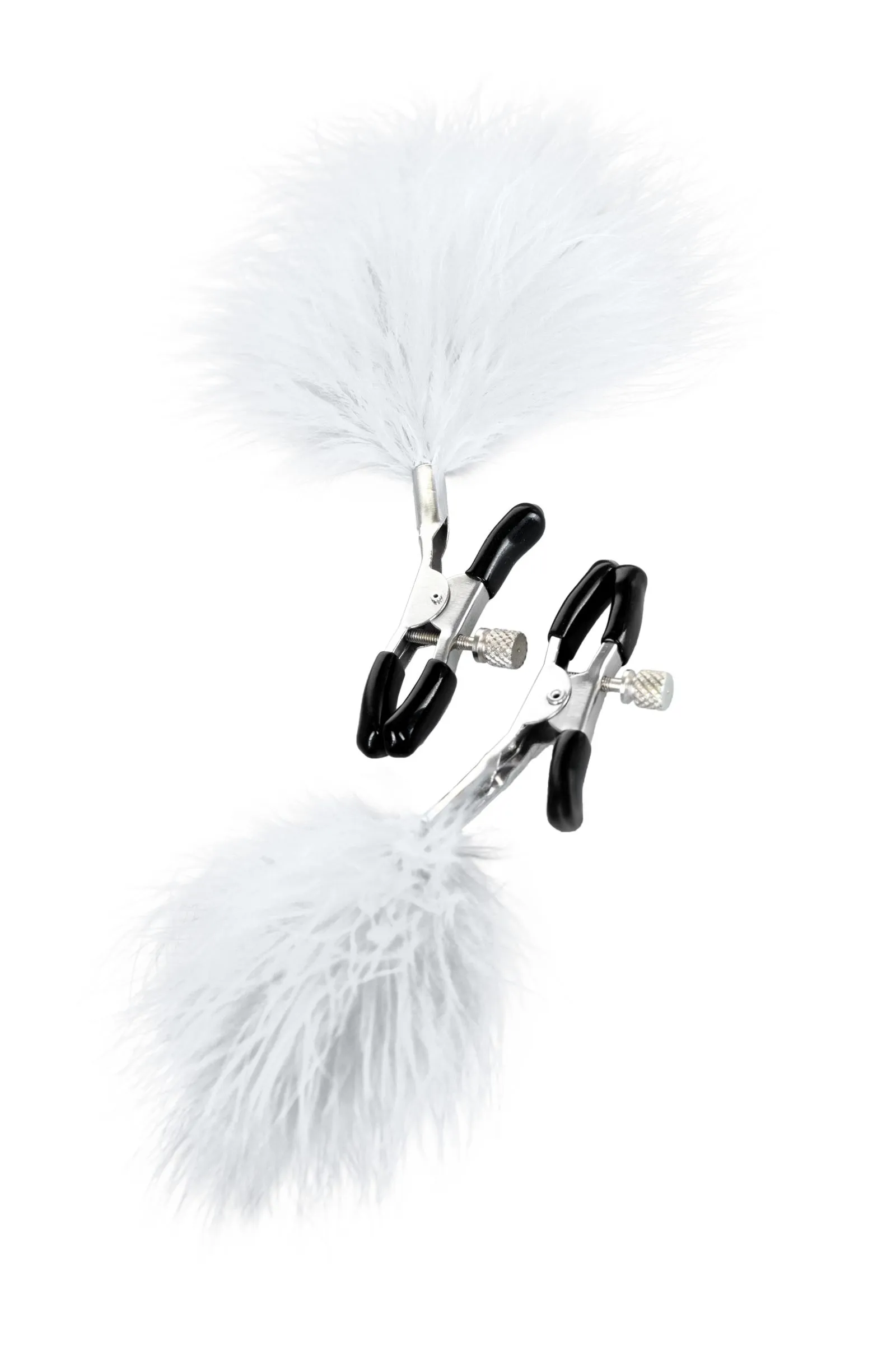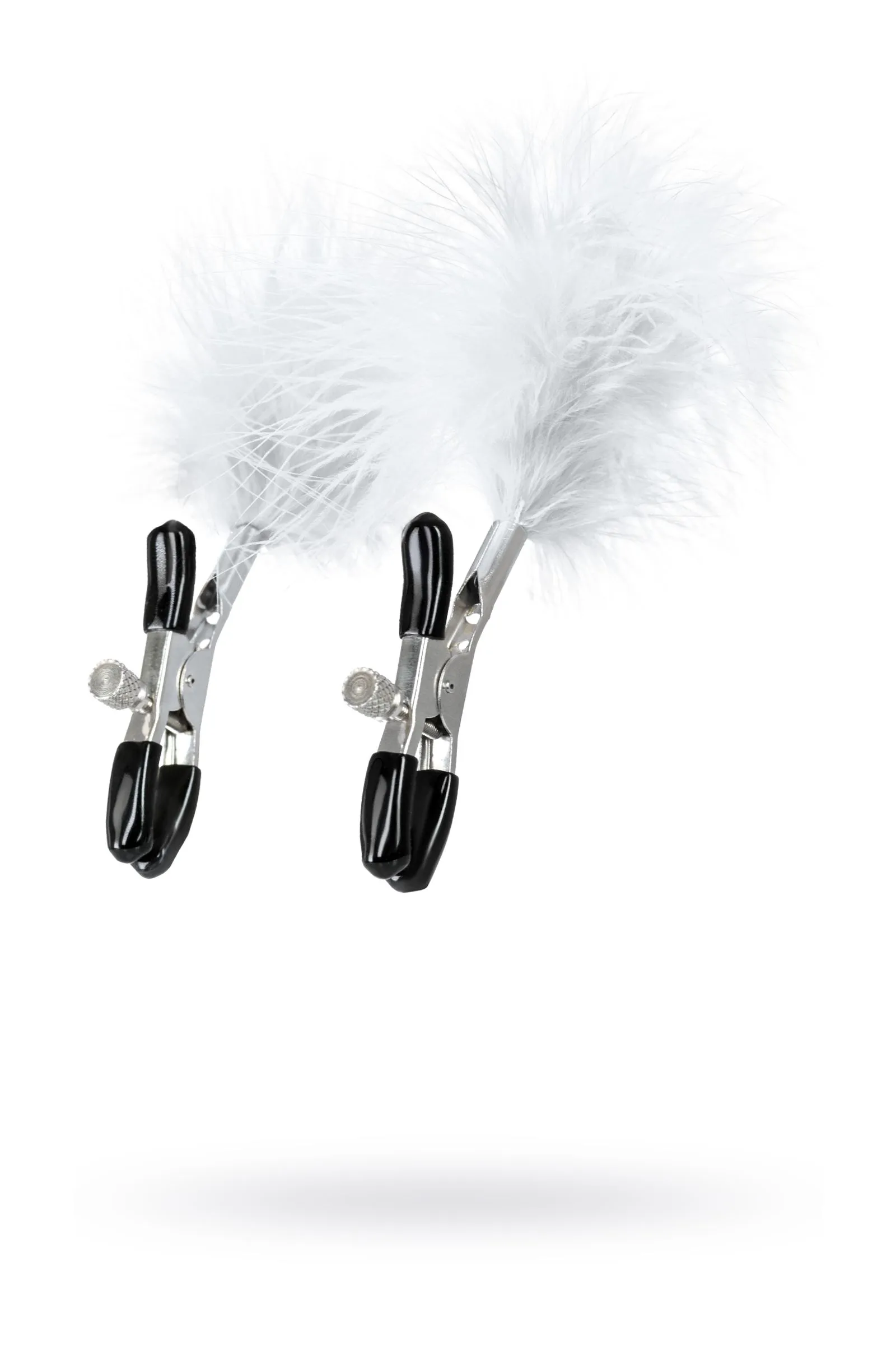 Пожалуй, самые милые из всех зажимов - украшенные перьями. Они стимулируют не только сжатием сосков, но и щекочут грудь. Сдавливание регулируется болтиком и может быть усилено или уменьшено во время интимной игры. Покрытие на концах зажимов защищает нежную кожу.