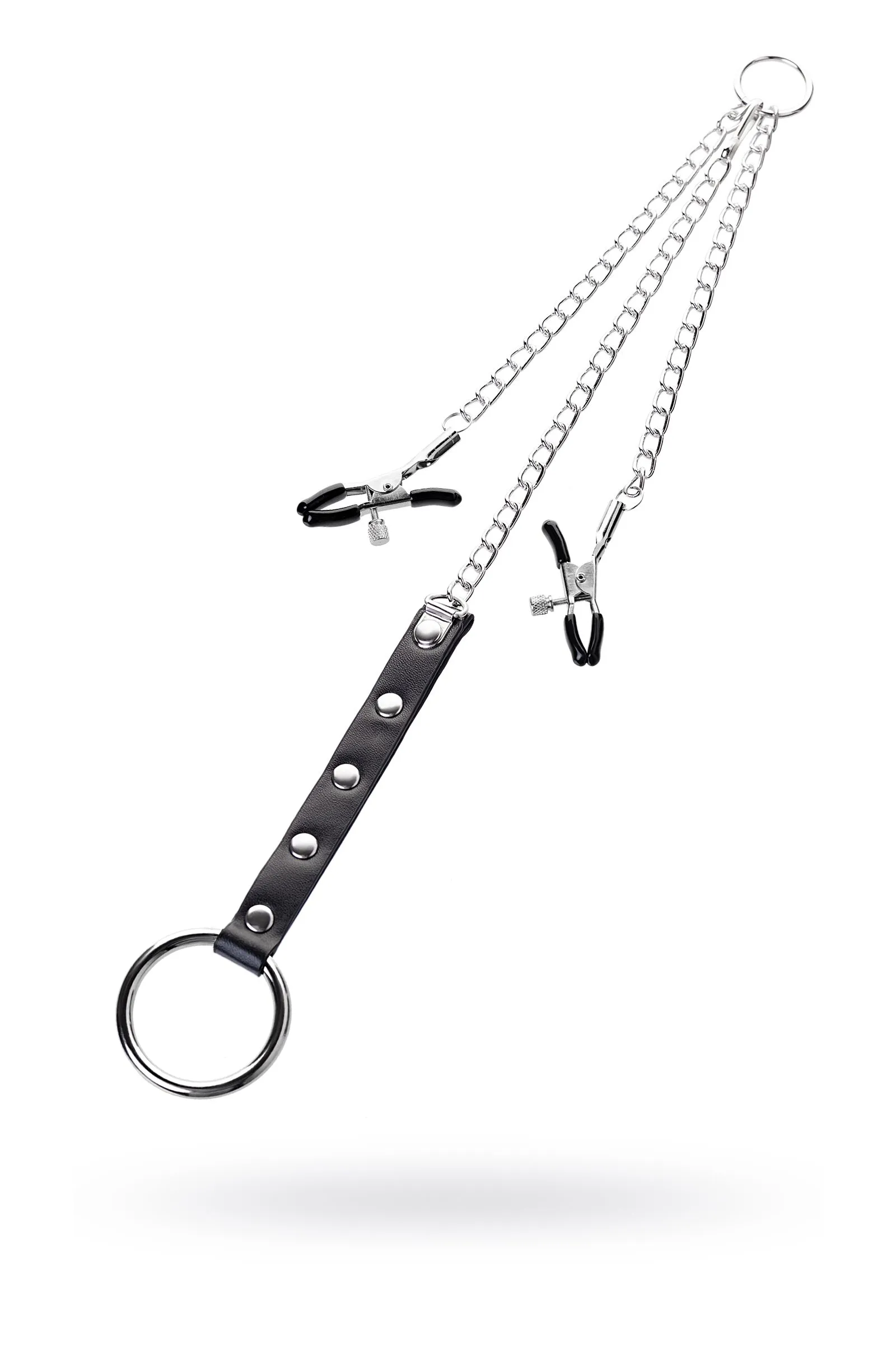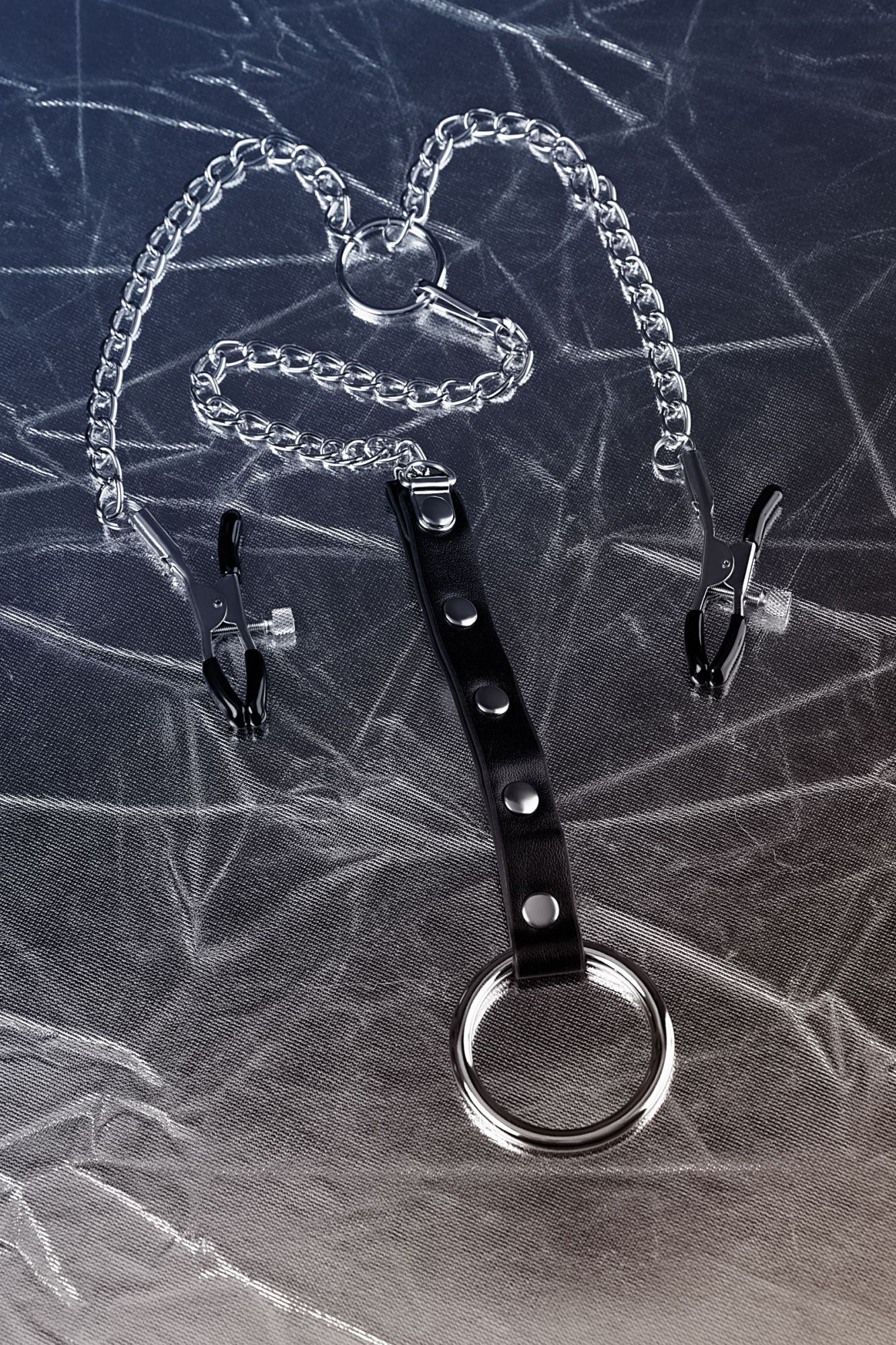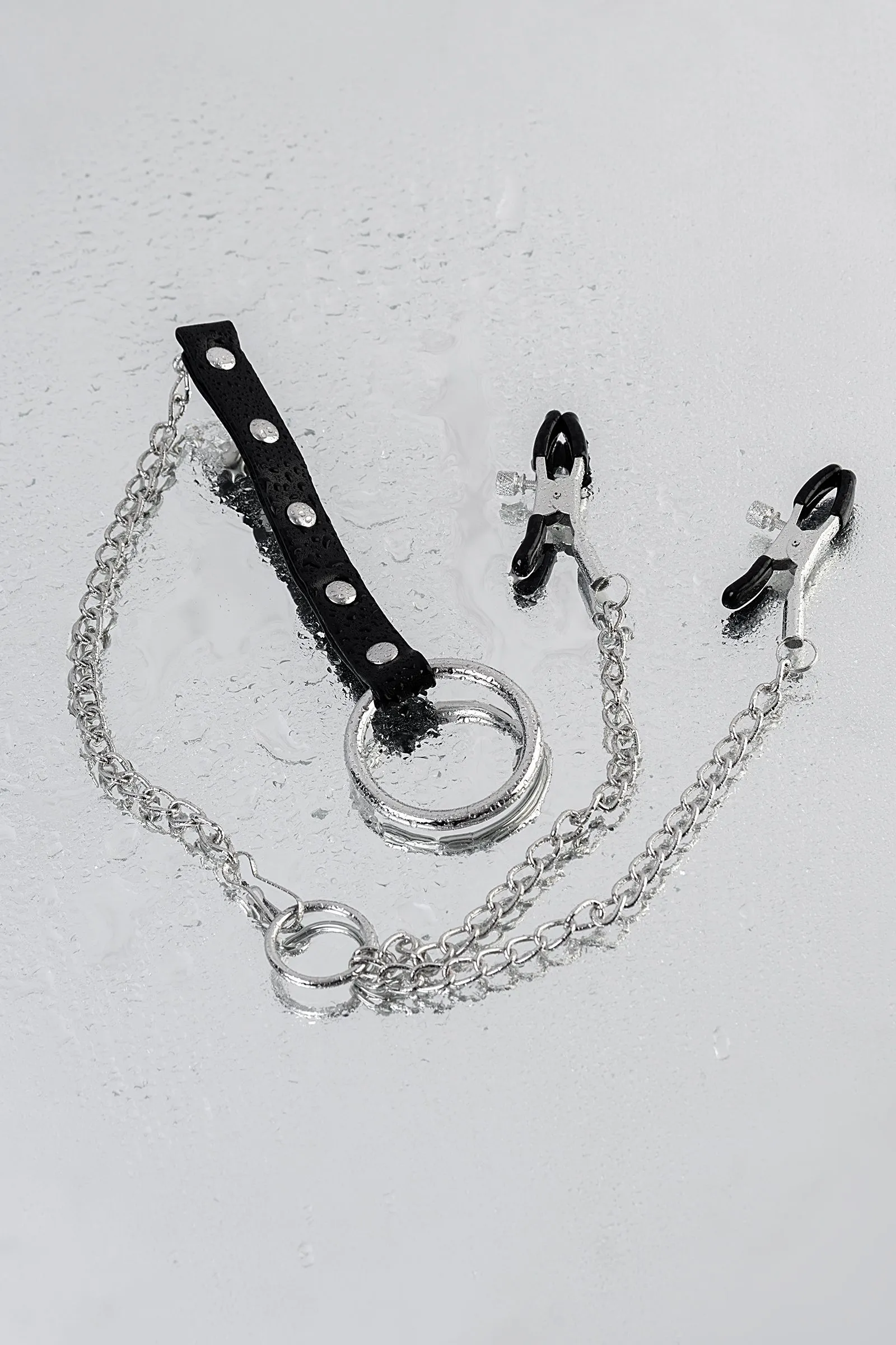 Мужская версия зажимов для воздействия на соски. Сила сжатия регулируется болтиками и может быть усилена или ослаблена во время интимной игры. Дополнительное ограничение свободы обеспечивает металлическое кольцо на пенис. Длина зажимов 5 см, внутренний диаметр кольца 4 см.