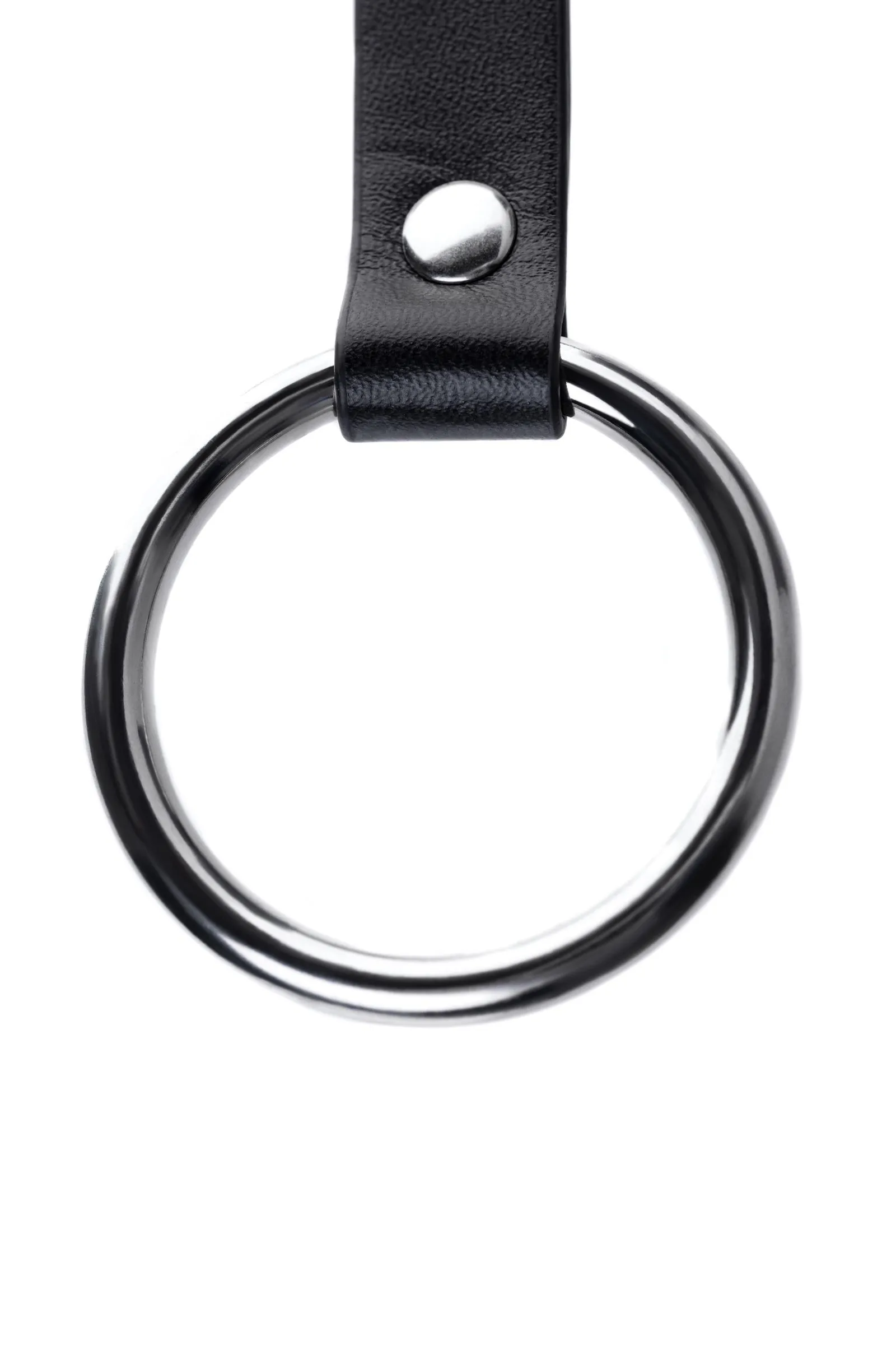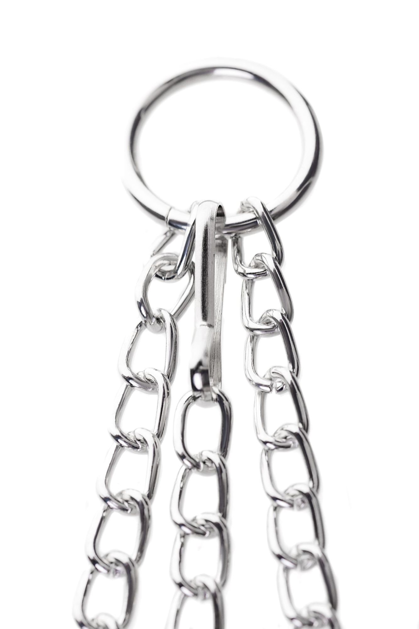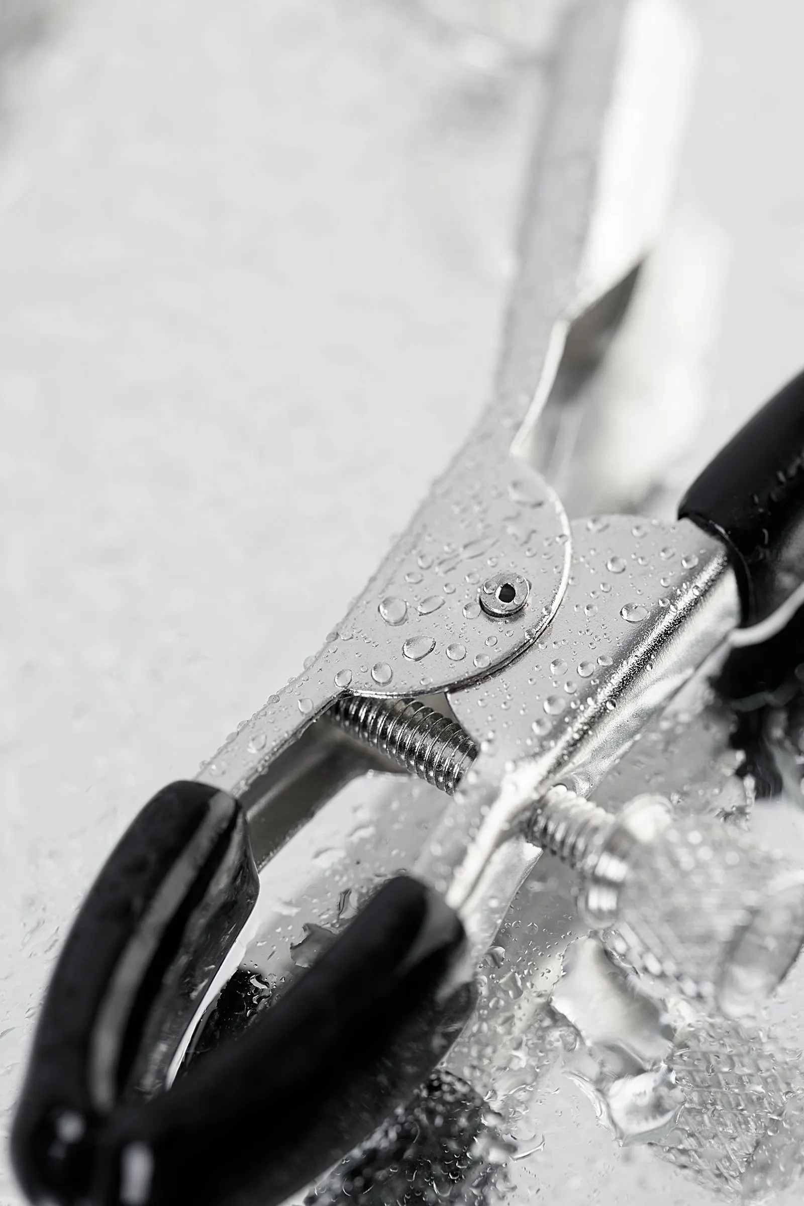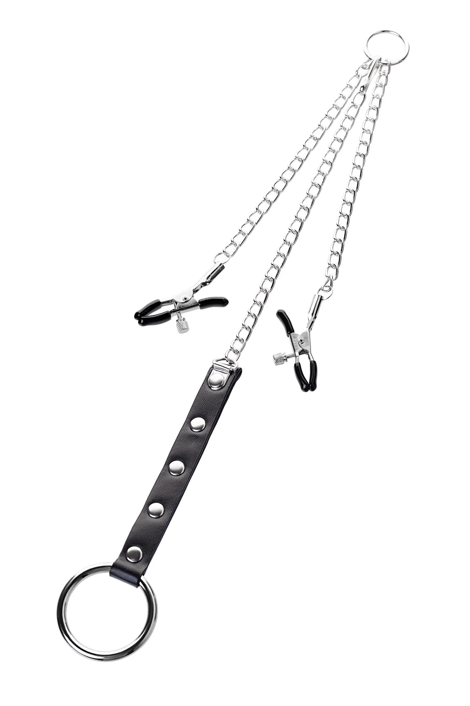 Мужская версия зажимов для воздействия на соски. Сила сжатия регулируется болтиками и может быть усилена или ослаблена во время интимной игры. Дополнительное ограничение свободы обеспечивает металлическое кольцо на пенис. Длина зажимов 5 см, внутренний диаметр кольца 4 см.