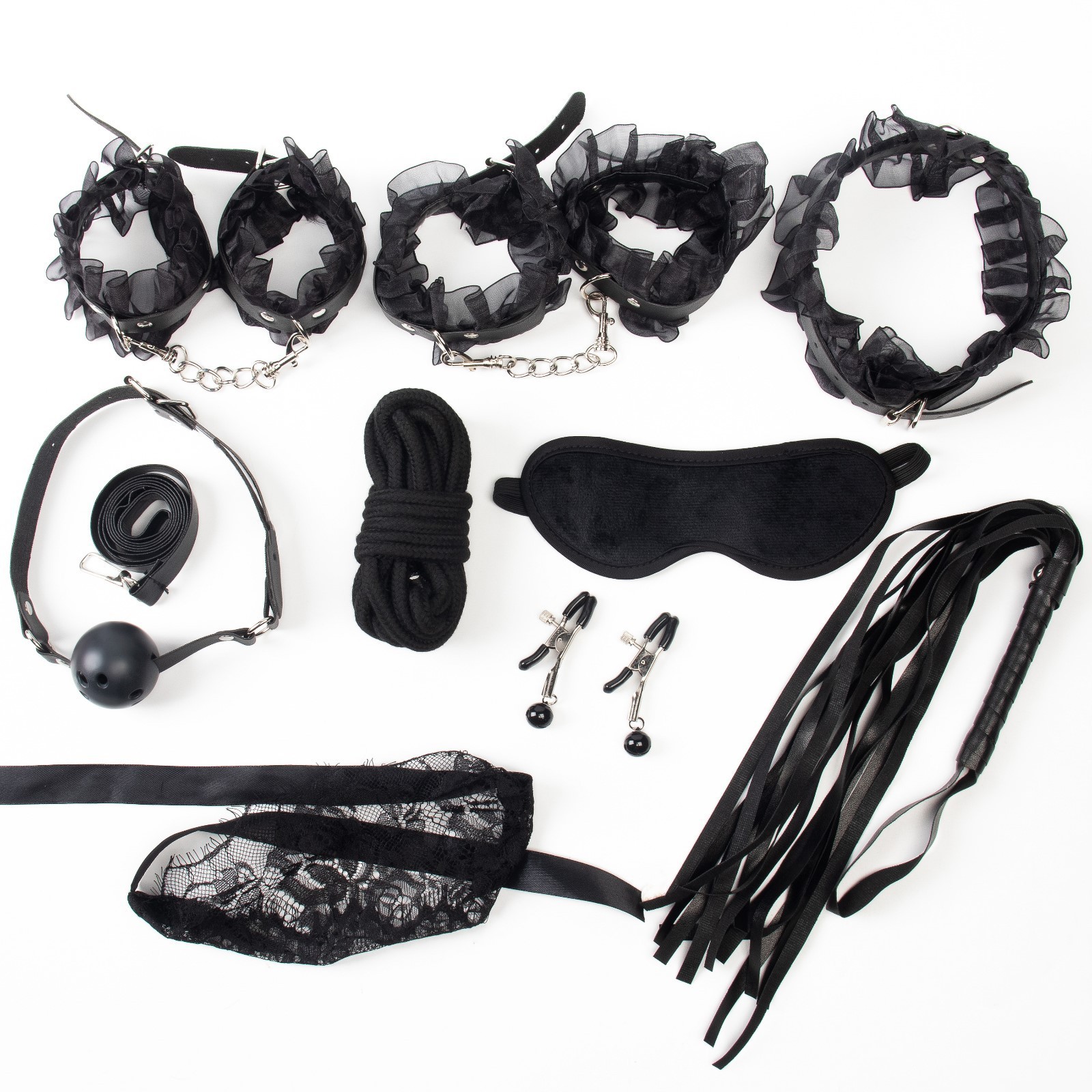 БДСМ набор выполнен из эко-кожи с кружевом - контраст нежности и грубости. Все ремни имеют систему регулировки. В состав набора входят 9 предметов: наручники, оковы, кляп, ошейник, поводок, верёвка, маска, зажимы для сосков, плеть.