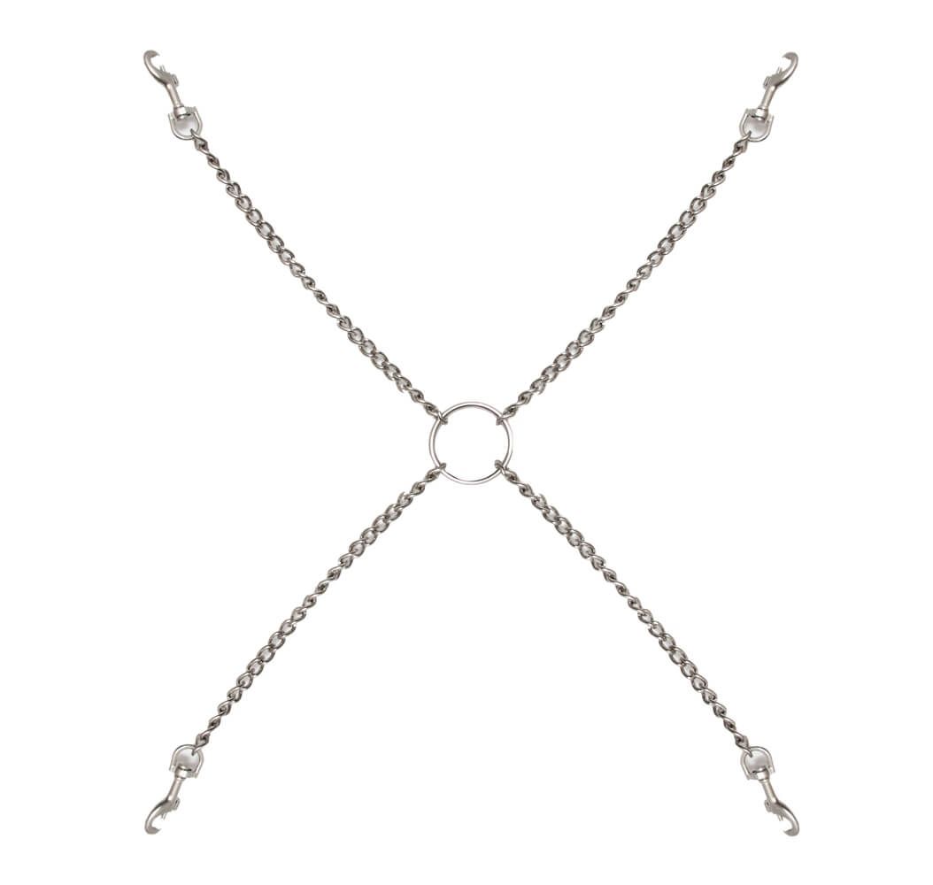 Цепь с центральным кольцом и четырьмя карабинами от компании "Подиум" может использоваться для соединения наручников и поножей, а также других девайсов БДСМ-тематики. Она выполнена из прочного металла, длина 25 см.