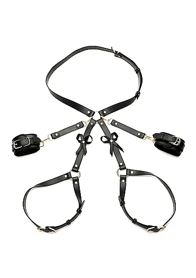 Очаровательные аксессуары для сексуальных игр и украшения своего партнера. Набедренная сбруя выполнена из мягкой экокожи и украшена бантиками. От поясной части идут перемычки, которые сковывают движения рук, если присоединить к ним наручи из комплекта.