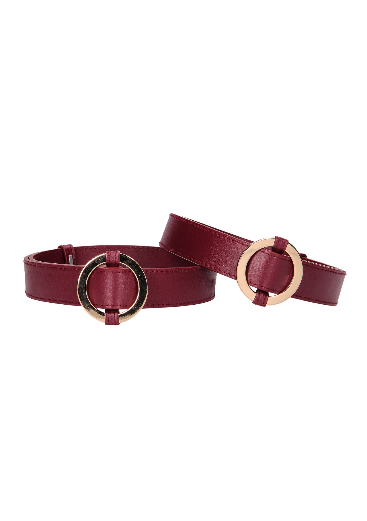 Thigh Cuffs – Burgundy- – кожаные наножники с цепочкой, предназначенные для ограничения свободы движения партнера во время эротических игр, а также в БДСМ практиках. Выполненные в бургундском цвете. Оковы декорированы металлическими золотыми кольцами, которые являются не только красивым элементом декора, но и к ним с помощью универсальных карабинов присоединяется короткая цепочка, чтобы соединять их между собой.