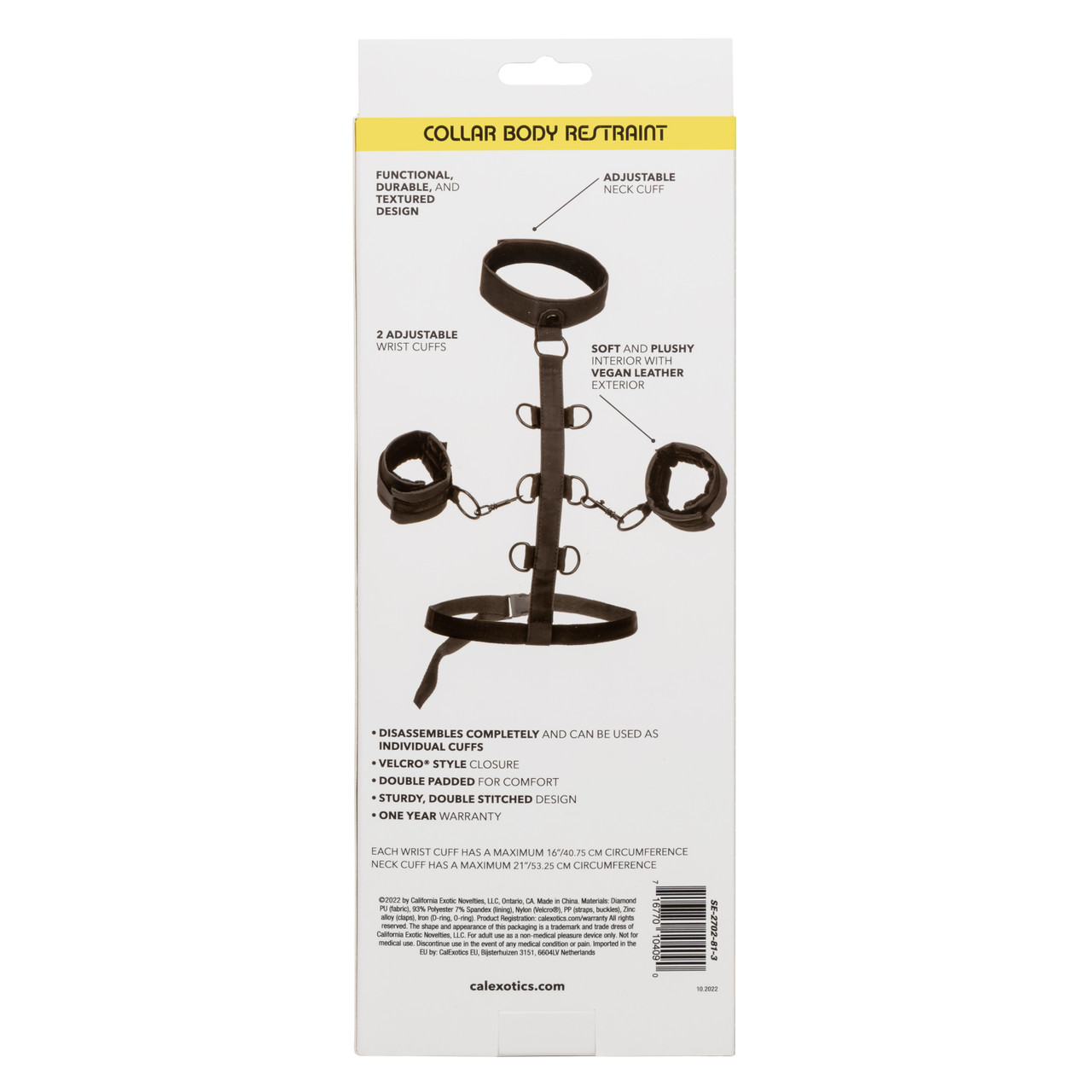 Раздвиньте границы удовольствия и откройте для себя бесконечные возможности связывания с ограничителем тела CalExotics Boundless™ Collar. Наденьте эту смелую удерживающую систему и наслаждайтесь страстной игрой с универсальными манжетами из веган-кожи, прочным воротником и многоуровневым удерживающим тросом.