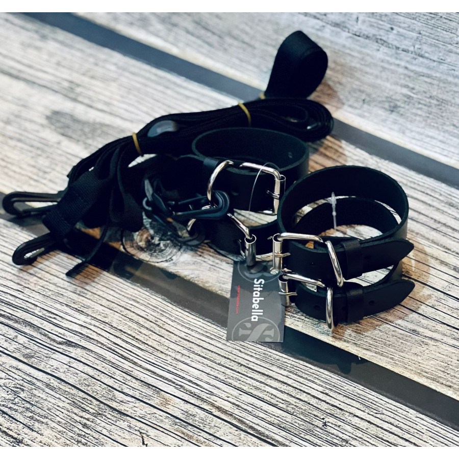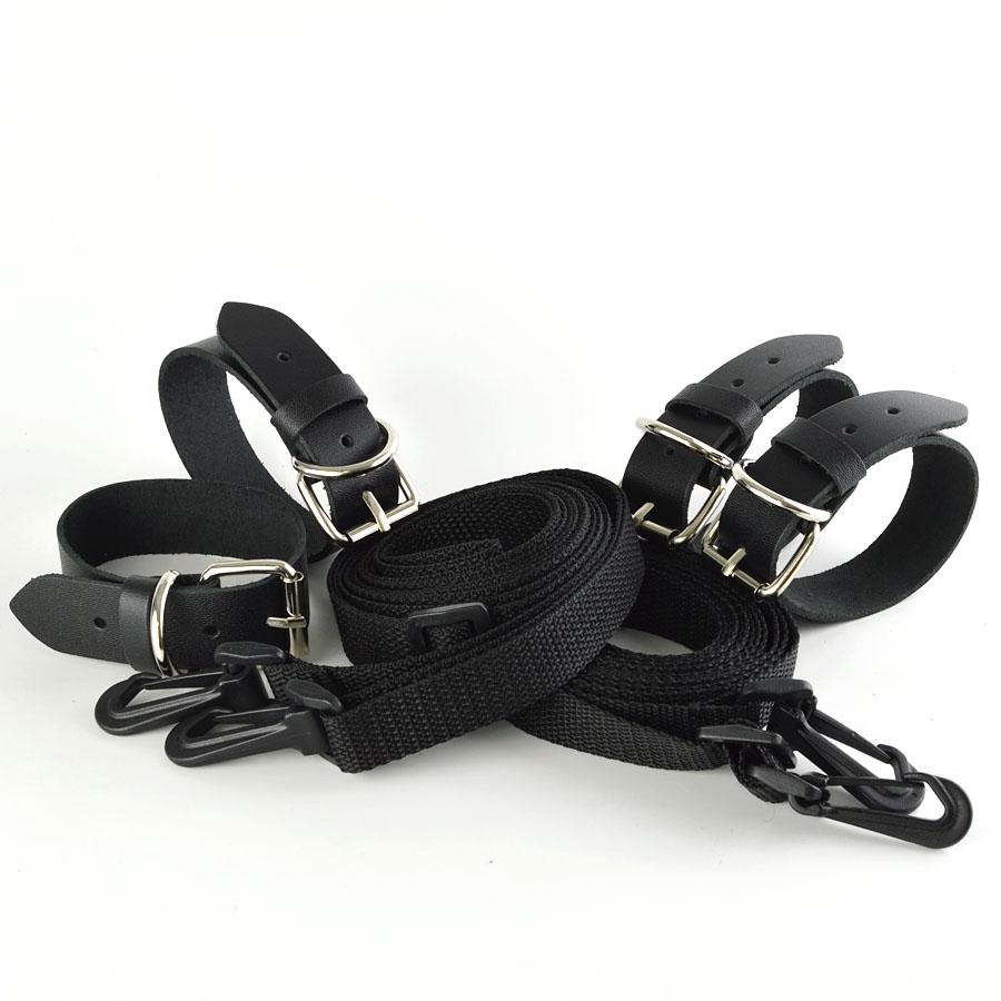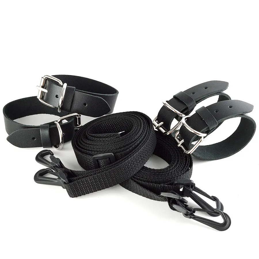 В комплект входят наручник, оковы и две растяжки на кровать. Длина каждого ремешка 2,7 м. Наручники и оковы крепятся к ремешкам при помощи прочных пластиковых карабинов.