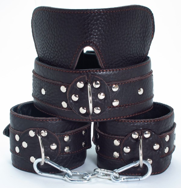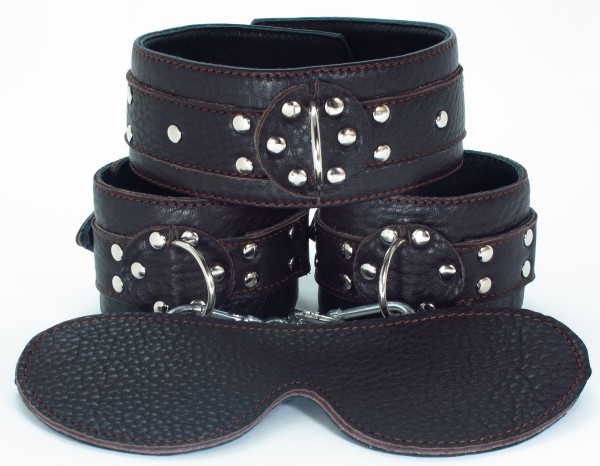 Стильный кожаный набор темно-коричневого цвета состоит из ошейника (ширина - 5 см), пары оков (ширина - 6 см) и маски на глаза. Все детали легко соединяются между собой при помощи карабинов, размер ошейника и оков регулируется при помощи застежки