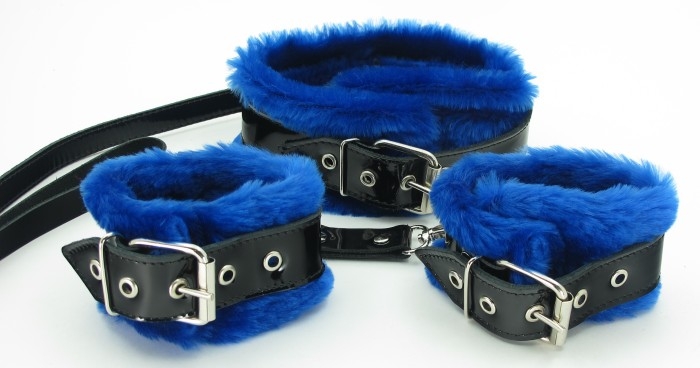 Наручники и ошейник сделаны из синего меха. Ремни на аксессуарах и поводок выполнены из натуральной черной лакированной кожи отличного качества. Наручники и ошейник фиксируются на теле при помощи ремней и металлических пряжек, нежный мех сделает прибывание в образе максимально комфортным. Ширина наручников - 6 см., ошейника - 5 см.