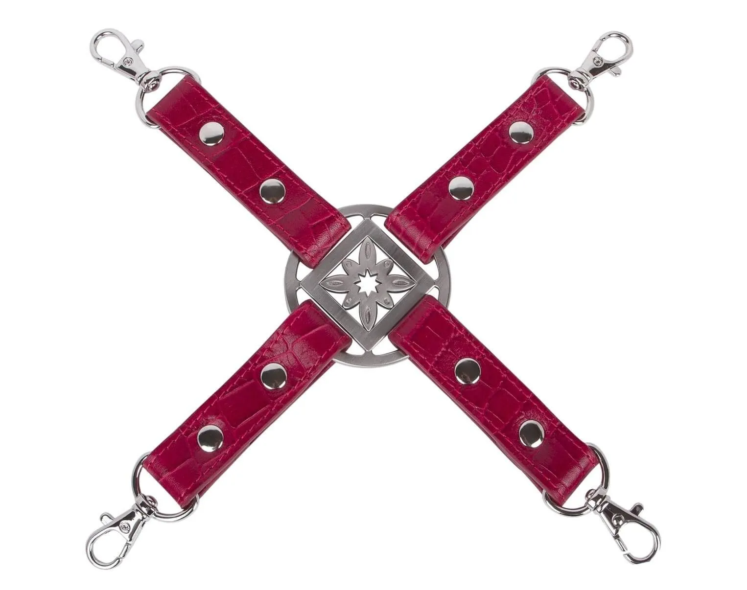 Кожаная сцепка с четырьмя карабинами от бренда Fire Horse предназначена для соединения различных БДСМ аксессуаров. Она выполнена из натуральной кожи красного цвета и декорирована клепками и кольцом с узором внутри. Несмотря на свой изысканный вид, стяжка отличается достаточной прочностью, позволяющей ей выдержать любые проявления неповиновения со стороны партнера. Она надежно зафиксирует руки или ноги непокорного и позволит Вам подойти к его воспитанию со всей ответственностью. Сцепка проста в использовании и надежна, поэтому с ней любая игра с элементами БДСМ будет безопасна.