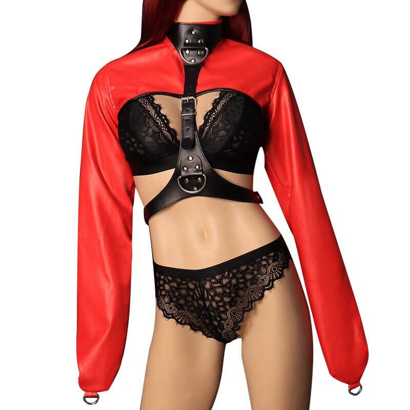 Бондажный комплект от бренда Lapin Rose позволит Вам обездвижить руки своей партнерши и зафиксировать их в нужном положении. На рукавах без отверстий для кистей есть небольшие полукольца, которые можно соединить между собой цепочкой или карабином (в комплект не входят). На ошейнике также есть полукольца более крупного размера, к которым можно присоединить другие бондажные аксессуары, чтобы разнообразить сценарии игры. Размер жакета регулируется при помощи ремешков с пряжками.