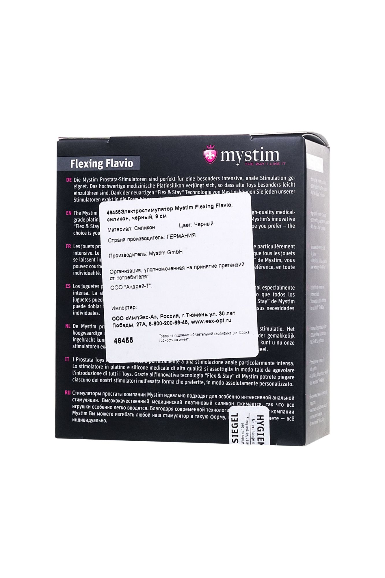 Электростимулятор Mystim Flexing Flavio, силикон, черный, 9 см Вы только взгляните на анальный электростимулятор Flexing Flavio от немецкого бренда Mystim. Миниатюрный стимулятор простаты только кажется нежным и деликатным. На деле он может гарантировать супер-стимуляцию “второго сердца мужчины”. Преимущество Flexing Flavio в его гибкой конструкции благодаря технологии Flex & Stay от Mystim. Просто согните его в ту форму, которая вам нравится, и он будет оставаться таким, пока вы не придадите ему новый вид. Flexing Flavio абсолютная новинка – биполярный электростимулятор простаты, с инновационной биполярной токопроводящей поверхностью благодаря которой, при подключении к блоку питания Mystim, происходит электро-стимуляция простаты и мышц ануса. Для активации электростимуляции необходимо подключить изделие к цифровому или аналоговому источникам тока (Mystim Tension Lover или Mystim Pure Vibes)в комплект не входят, приобретаются отдельно. Гибкая форма и небольшой размер в сочетании с электроимпульсами – превосходная комбинация для адептов и новичков мира удовольствия от анальной стимуляции. Длина 9 см Диаметр в широкой части 3 см 100% медицинский силикон Страна бренда Германия