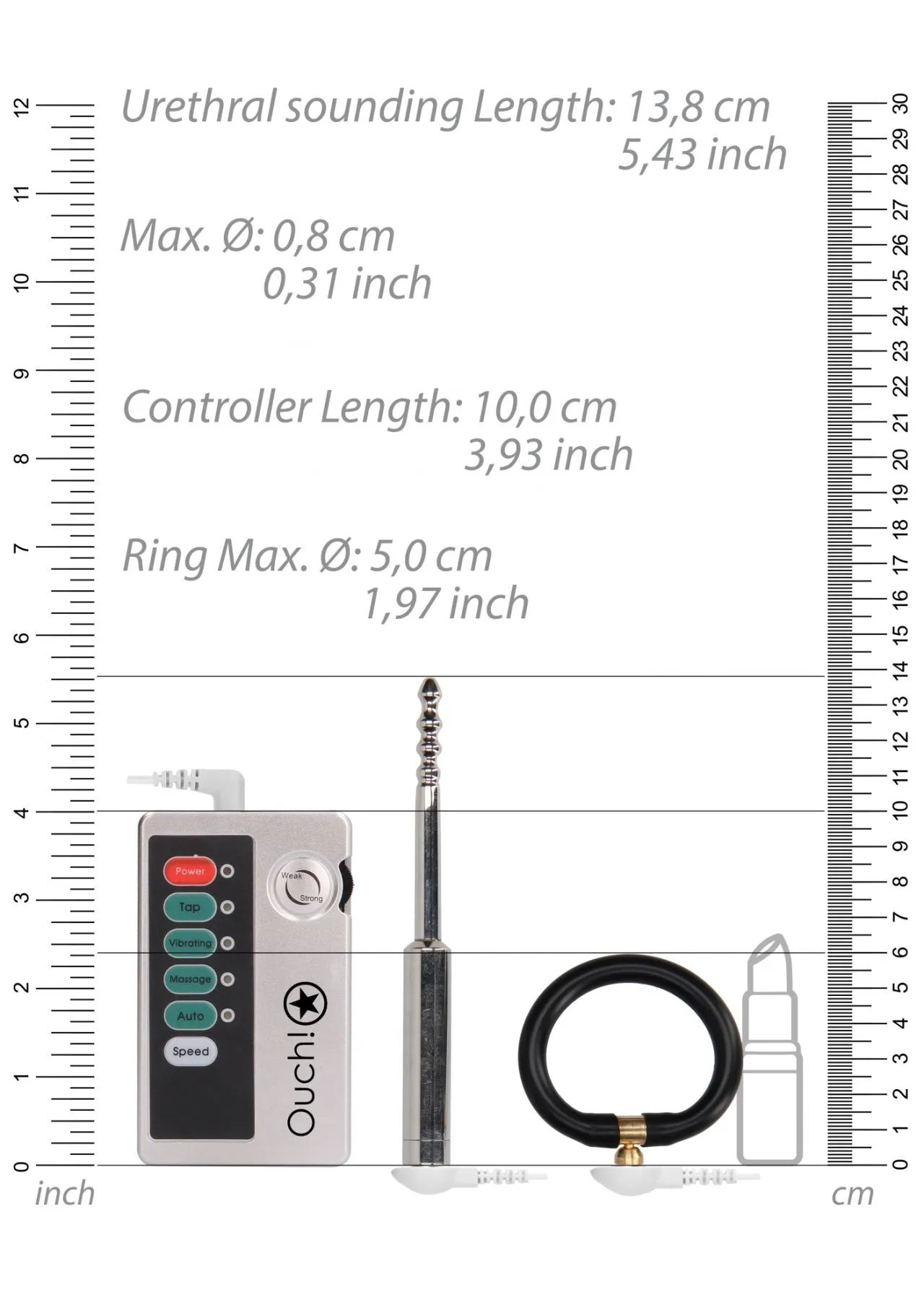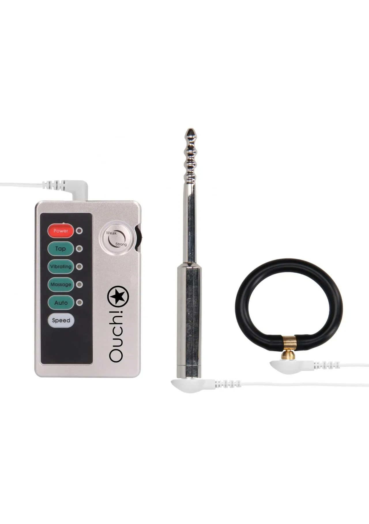 Набор из уретрального плага, эрекционного кольца и блок питания для электростимуляции.