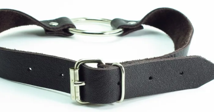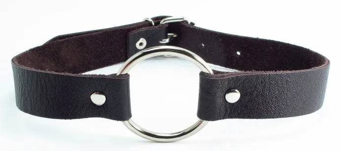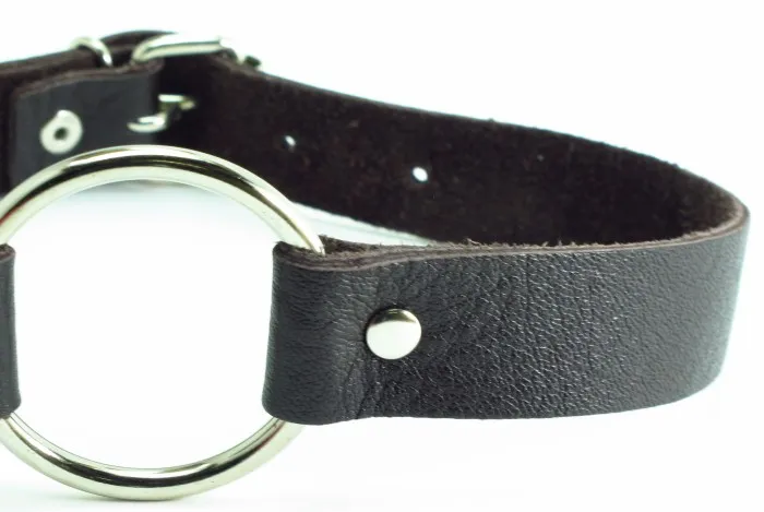 Кляп в виде открытого кольца на коричневом ремешке, изготовленном из качественной кожи (ширина ремня - 2 см) . Для регулировки длины кляпа на ремешке имеется 6 отверстий. Диаметр кольца - 4,5 см.