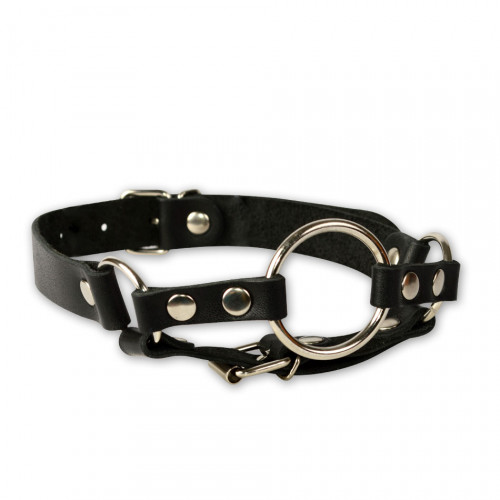 Кляп-рамка изготовлен из натуральной высококачественной кожи чёрного цвета.  Внешний диаметр кольца 44 мм,. Зафиксировать и отрегулировать изделие можно при помощи металлической пряжки. Вся металлическая фурнитура имеет никелевое покрытие.
