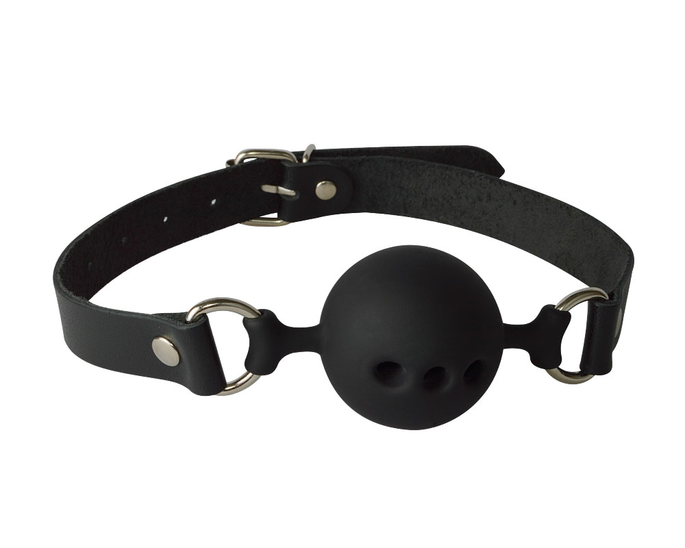 Кляп-шар изготовлен из силикона, диаметр 45 мм. Сфера имеет три сквозных отверстия. Ремешки выполнены из натуральной кожи. Кляп регулируется при помощи пряжки.