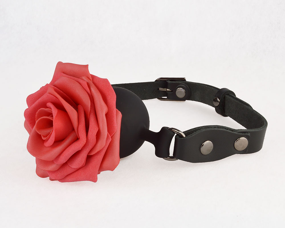 Кляп-шар изготовлен из силикона, диаметр 44 мм. Ремешки из натуральной кожи черного цвета. Фурнитура имеет никелевое покрытие. Роза изготовлена из фоамирана.