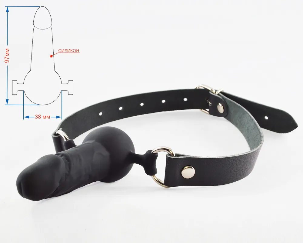 Силиконовый кляп в виде сферы и небольшого фаллоимитатора, прикреплен к ремешкам из натуральной кожи. Регулируется кляп при помощи металлической пряжки. Металлическая фурнитура имеет никелевое покрытие. Общая длина 59 см. Max диаметр шара 38 мм, длина кляпа 9,7 см. Ширина ремешков 20 мм.