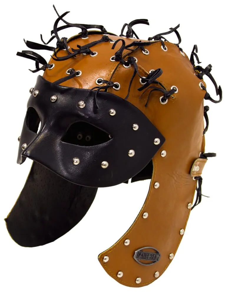 Шлем выполнен из натуральной кожи черного и рыжего цветов и украшен металлическими клепками и тонкими полосками кожи.