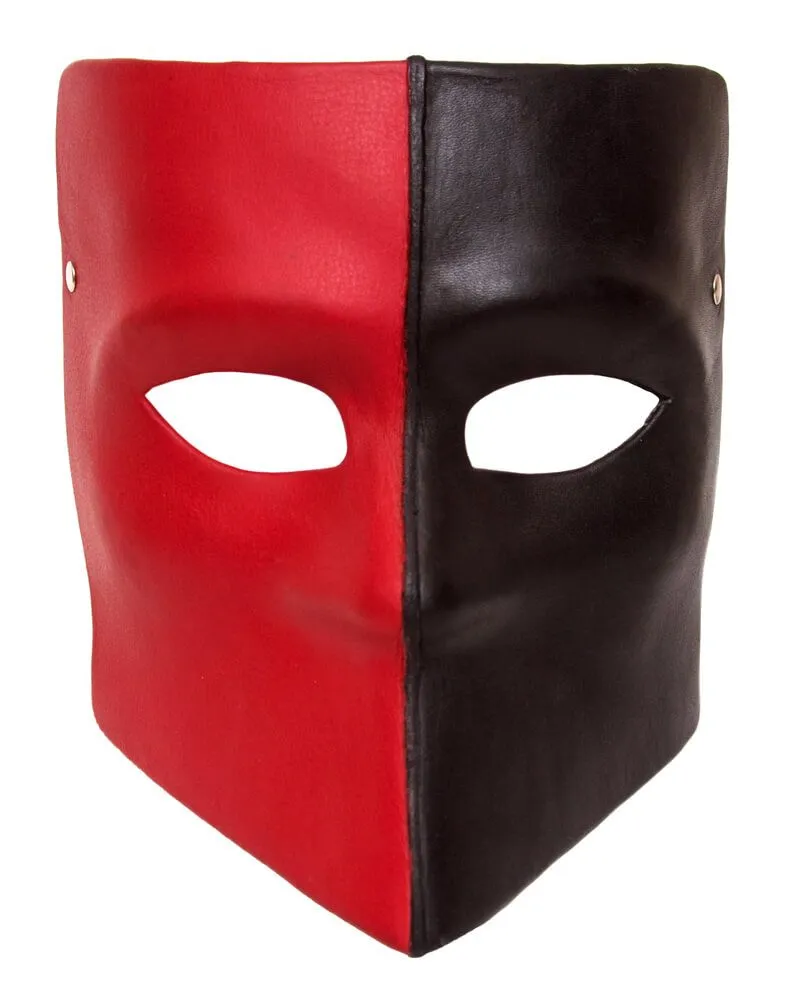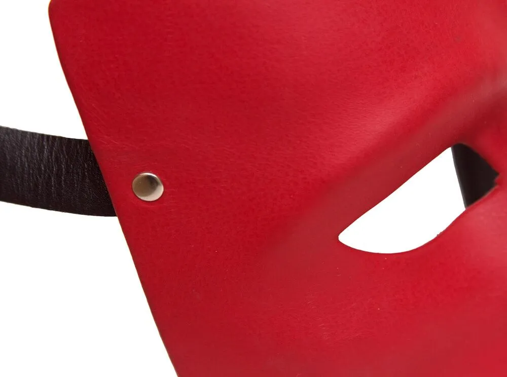 Маска обтянута натуральной кожей черно-красного цвета. Сзади крепится на ремешки с пряжкой, что позволяет отрегулировать размер для комфортного использования.