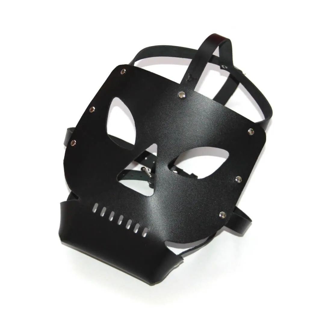 Маска в виде черепа выполнена из натуральной кожи черного цвета и металлической фурнитуры. С ней Вы сможете перевоплотиться в мрачного персонажа, который с удовольствием будет наказывать своего партнера за любую провинность. Маска станет отличным дополнением как к карнавальному, так и к ролевому эротическому костюму. Также она поможет создать нужную атмосферу во время игр с элементами БДСМ. Маска застегивается при помощи ремешка, размер можно регулировать.