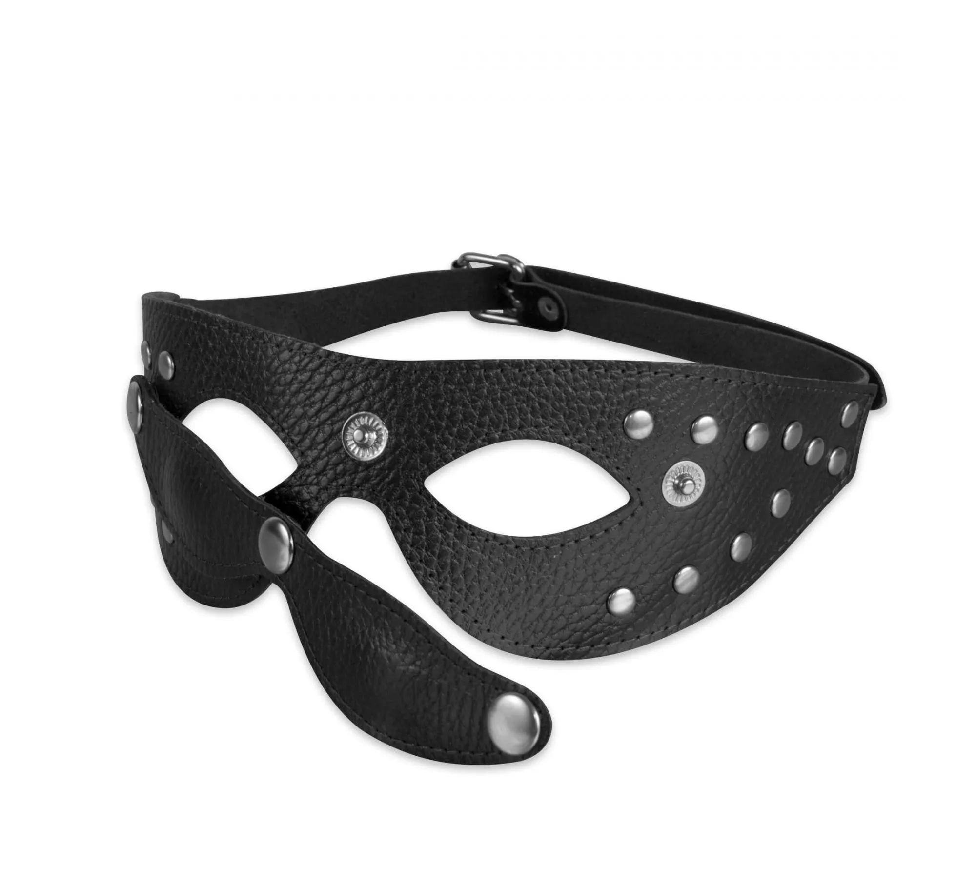 Маска выполнена из натуральной кожи черного цвета с велюровой подкладкой и декорирована металлическими клепками. Она подойдет как мужчинам, так и женщинам. Размер универсальный.