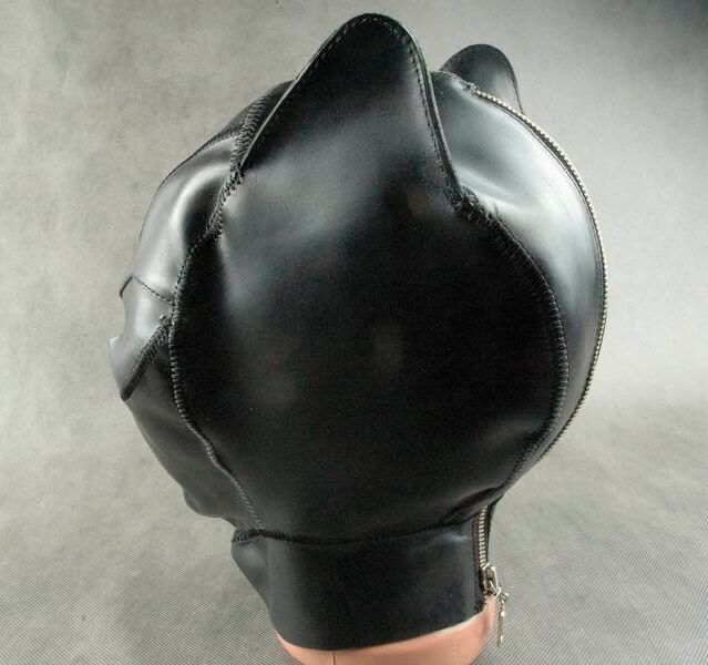 Женский шлем "Черная пантера" от бренда Beastly сделан из натуральной кожи черного цвета и оснащен длинной молнией на затылке. Он неподшитый и плотно садится на голову. У шлема есть прорези для глаз и только два небольших отверстия под носом, поэтому дыхание будет частично ограничено.
