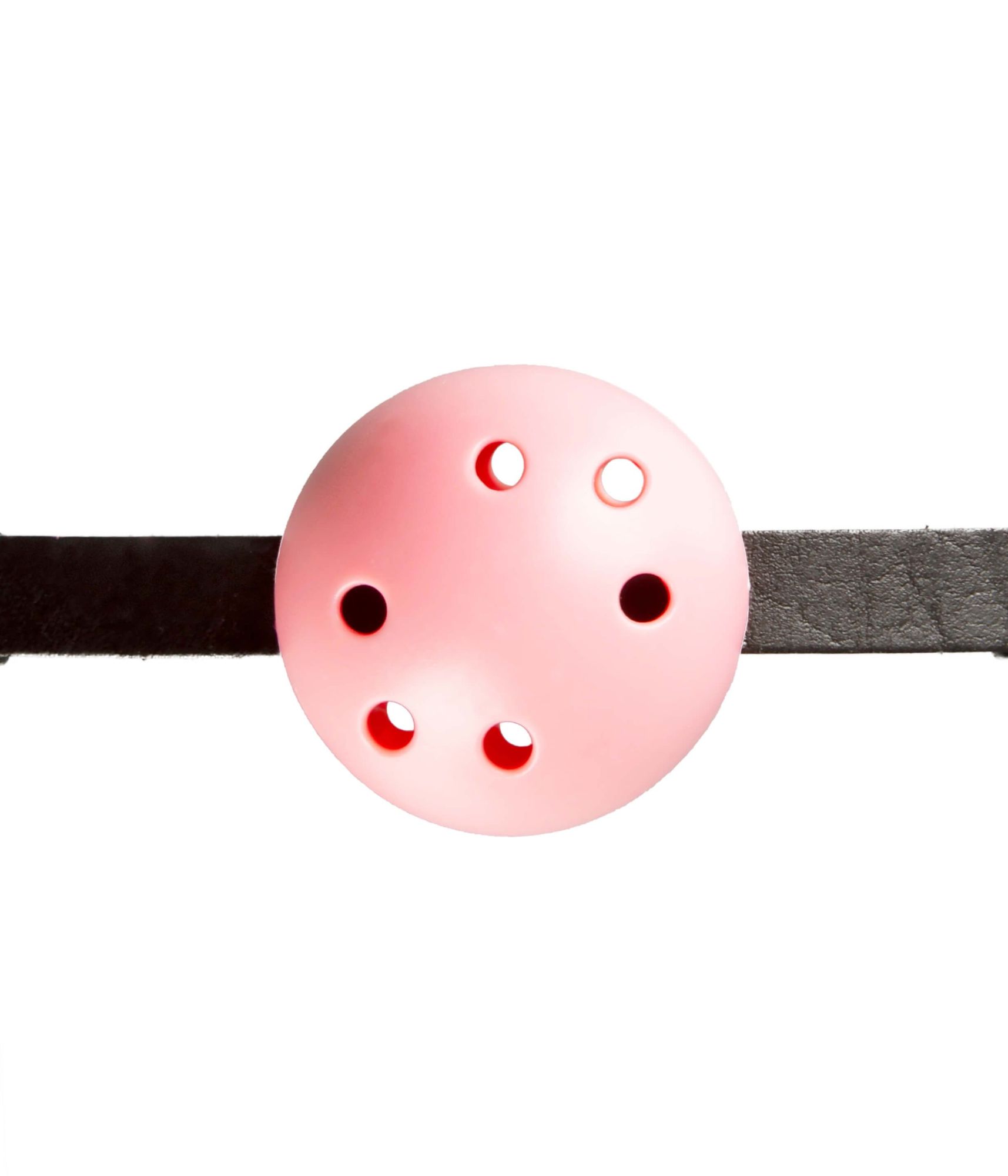 - Розовый шар на кожаном ремешке полностью закрывает рот.