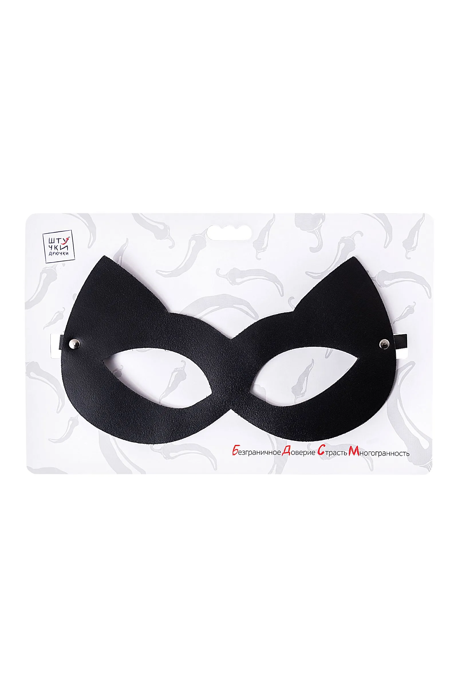 Маска «Кошка» «Штучки-Дрючки» Кожаная маска «Кошка» от бренда «Штучки-Дрючки» — это аксессуар, который должен быть в коллекции каждой ценительницы удовольствий, ведь с ее помощью можно: Исследовать себя Ограничение зрения позволяет полностью сосредоточиться на ощущениях и обостряет тактильное восприятие. В маске привычные прикосновения, поцелуи или тиклинг раскрываются целой гаммой новых чувств. Играть в подчинение Вжиться в роль послушной «пленницы» или насладиться тотальным контролем над чувствами партнера — с маской «Кошка» можно переписать сценарий прямо во время игры. Экспериментировать Надевай маску только на время прелюдии, чтобы усилить возбуждение, или под конец игры, чтобы сделать финал фееричным. Попробуй все виды удовольствия с кожаной маской «Кошка» от «Штучки-Дрючки»