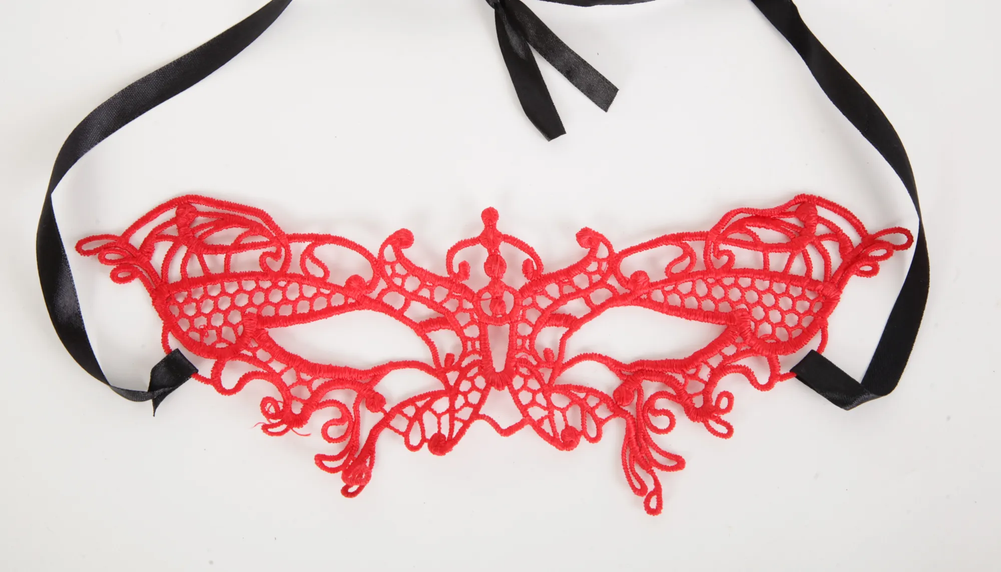 Красная кружевная маска в венецианском стиле с многочисленными узорами. Завязывается на черные атласные ленты. Размеры маски: длина- 24,5 см, ширина - 9 см. Упаковка- картонный конверт.
