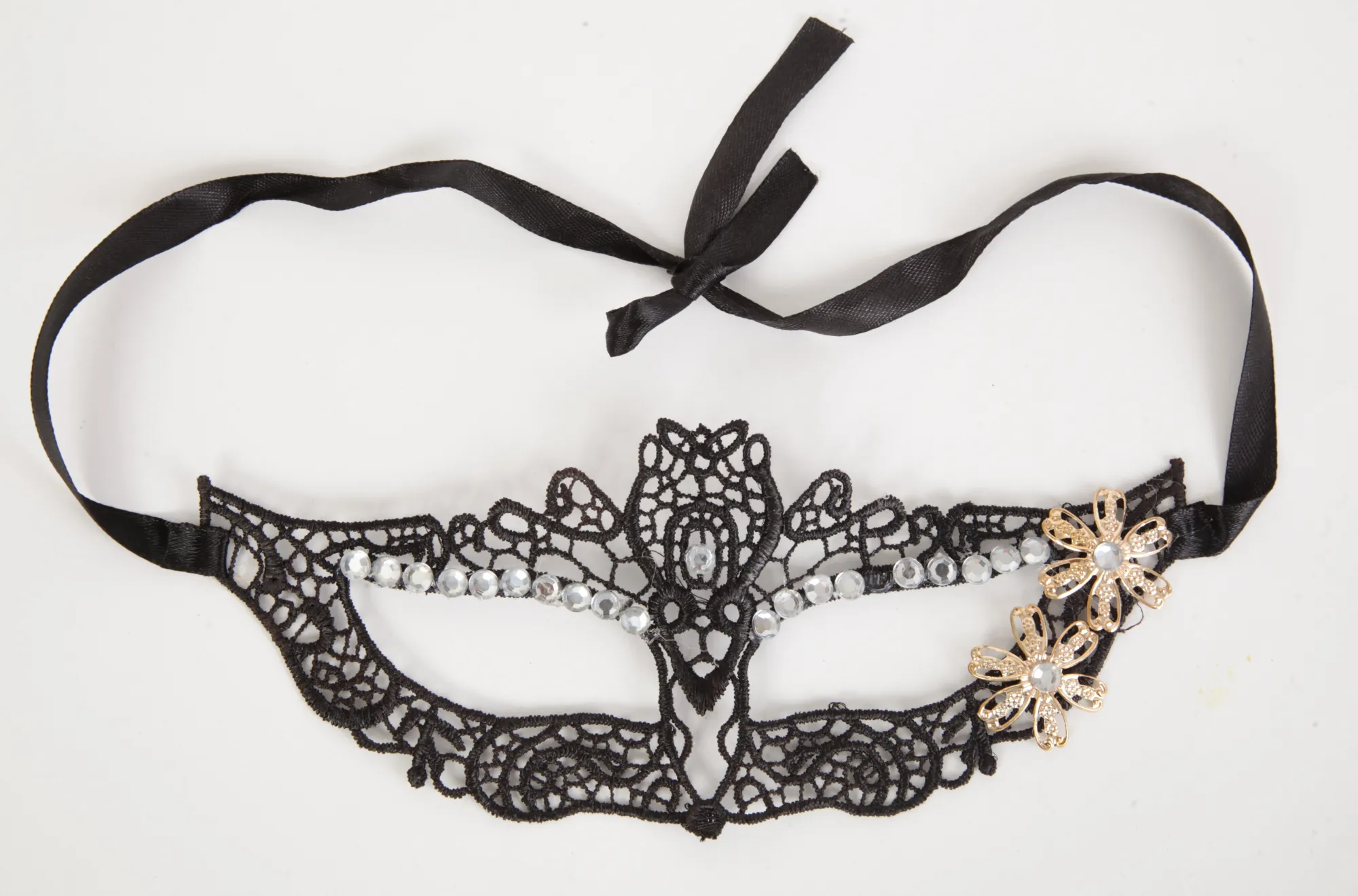 Кружевная маска в венецианском стиле с многочисленными узорами, стразами и цветочками. Завязывается на атласные ленты. Размеры маски: длина- 20 см, ширина - 8,5 см. Упаковка- картонный конверт.