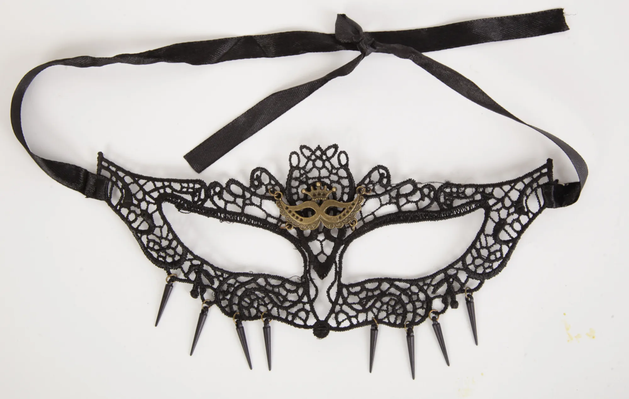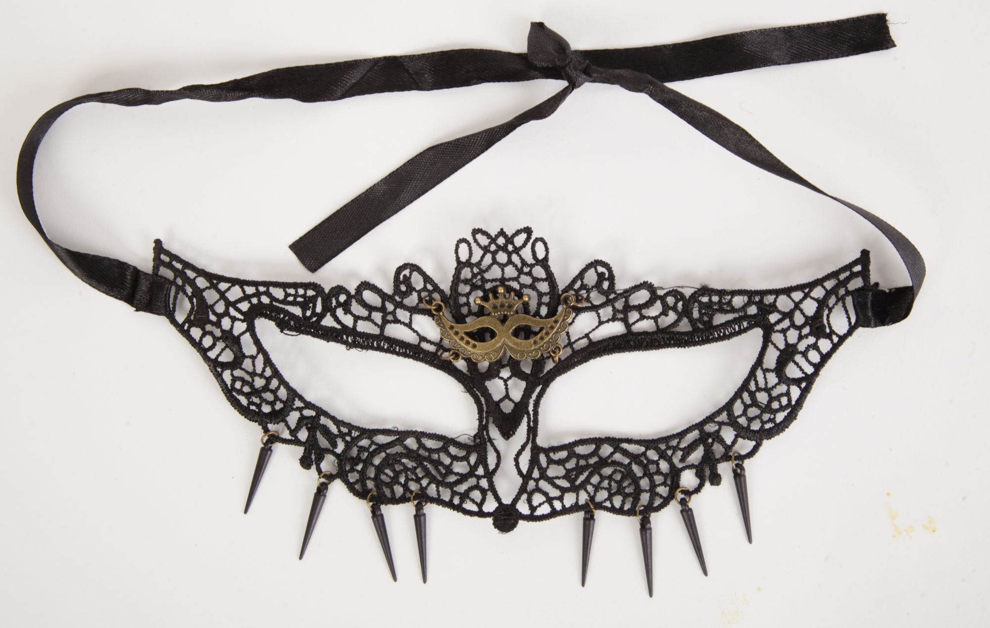 Кружевная маска в венецианском стиле с многочисленными узорами. С бронзовой масочкой по центру и шипиками в виде дополнительного украшения. Завязывается на атласные ленты. Размеры маски: длина- 22 см, ширина - 8,5 см. Упаковка- картонный конверт.