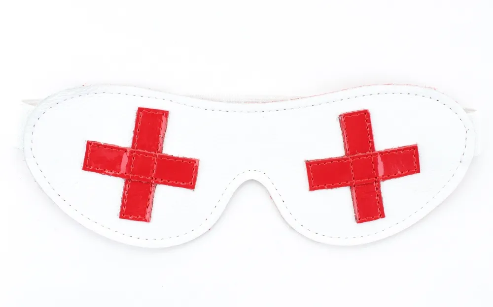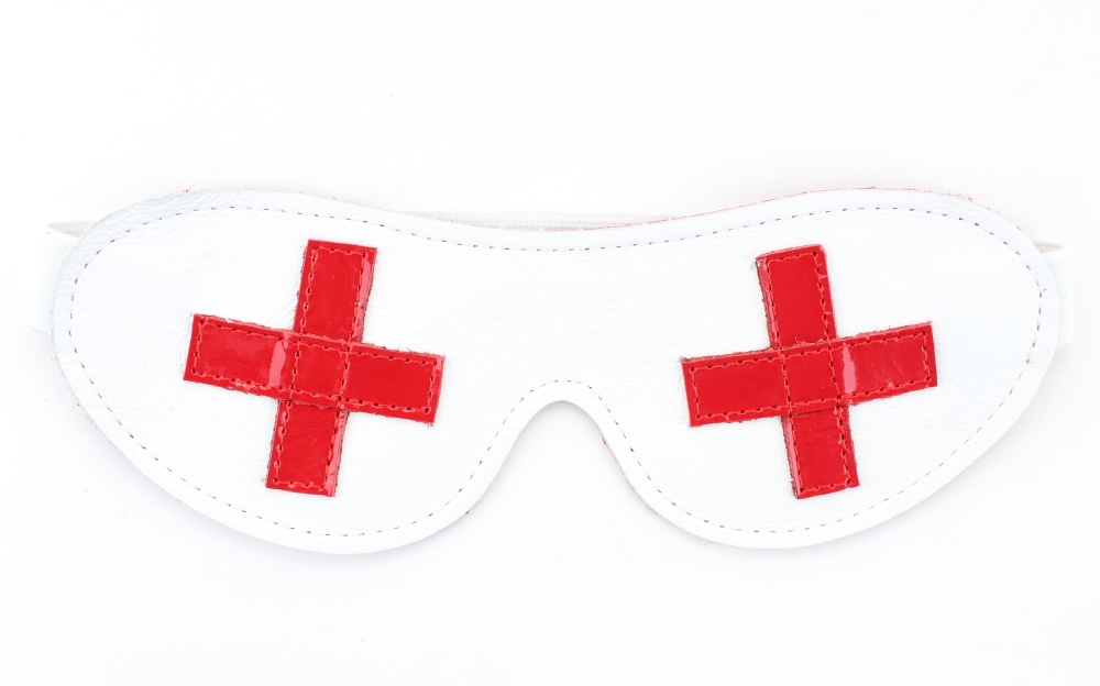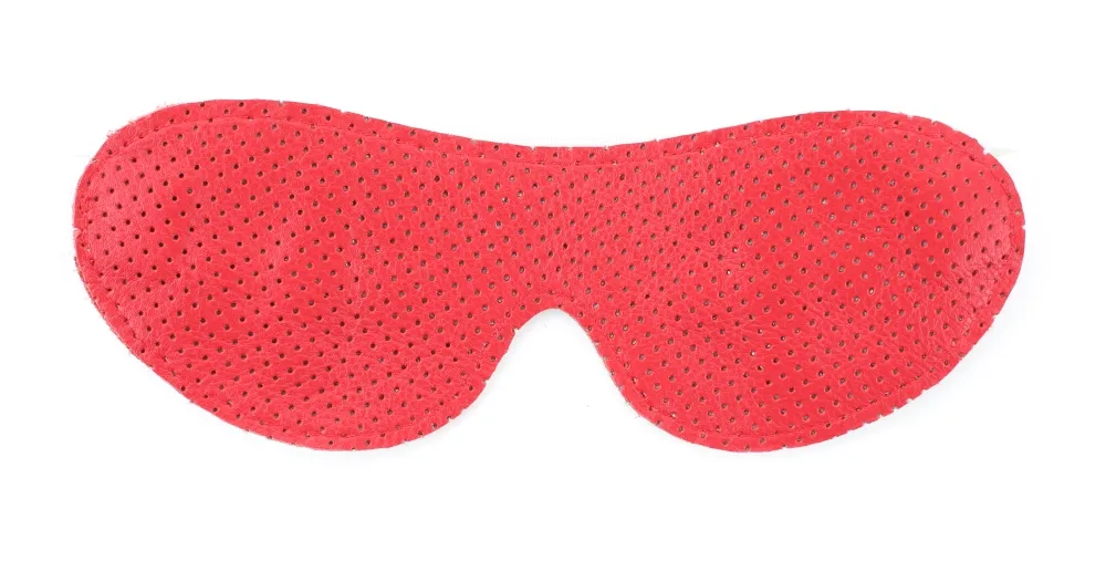 Маска из натуральной кожи на резиночке. Декорирована ярко-красными крестиками. Имеет красный подклад из мягкой перфорированной кожи. Макс. ширина - 7 см. Крепится к голове при помощи резинки.