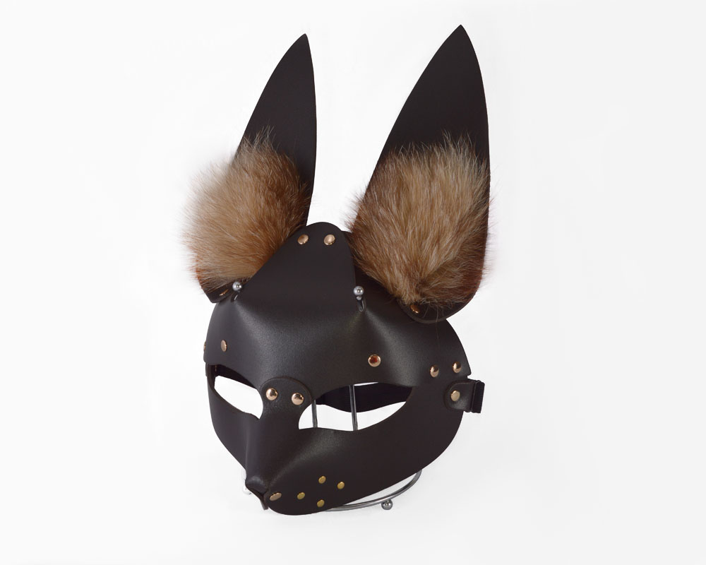 Маска изготовлена из натуральной кожи темно-коричневого цвета, ушки декорирована натуральным мехом. Размер маски можно подогнать при помощи регулятора. Размер универсальный.