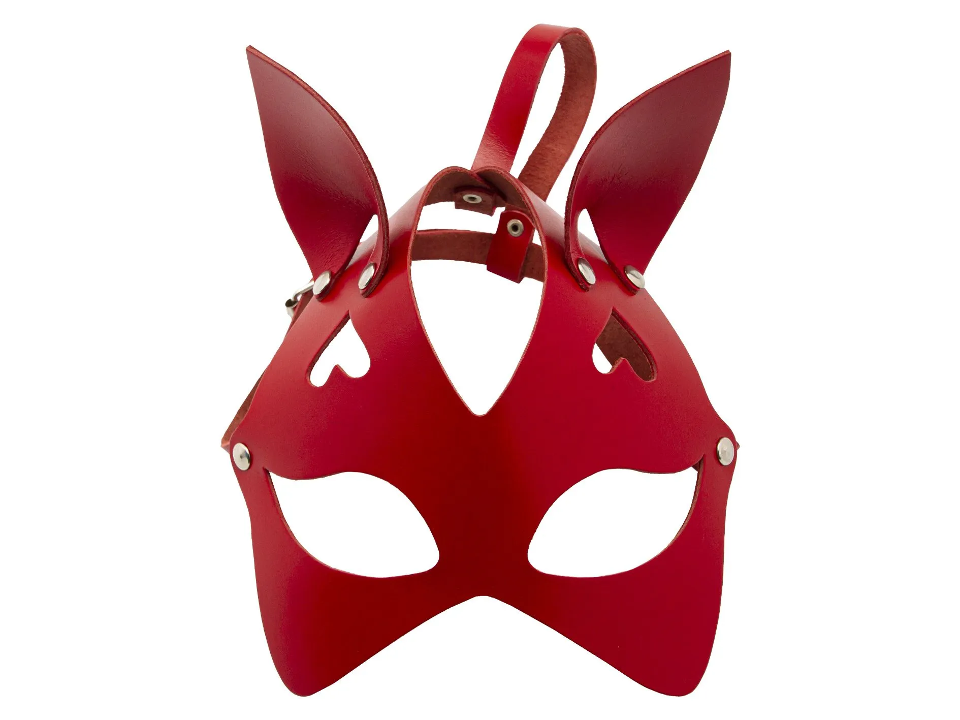 Маска выполнена из натуральной кожи красного цвета. Она регулируется по размеру при помощи ремешка с пряжкой, поэтому носить ее будет комфортно.