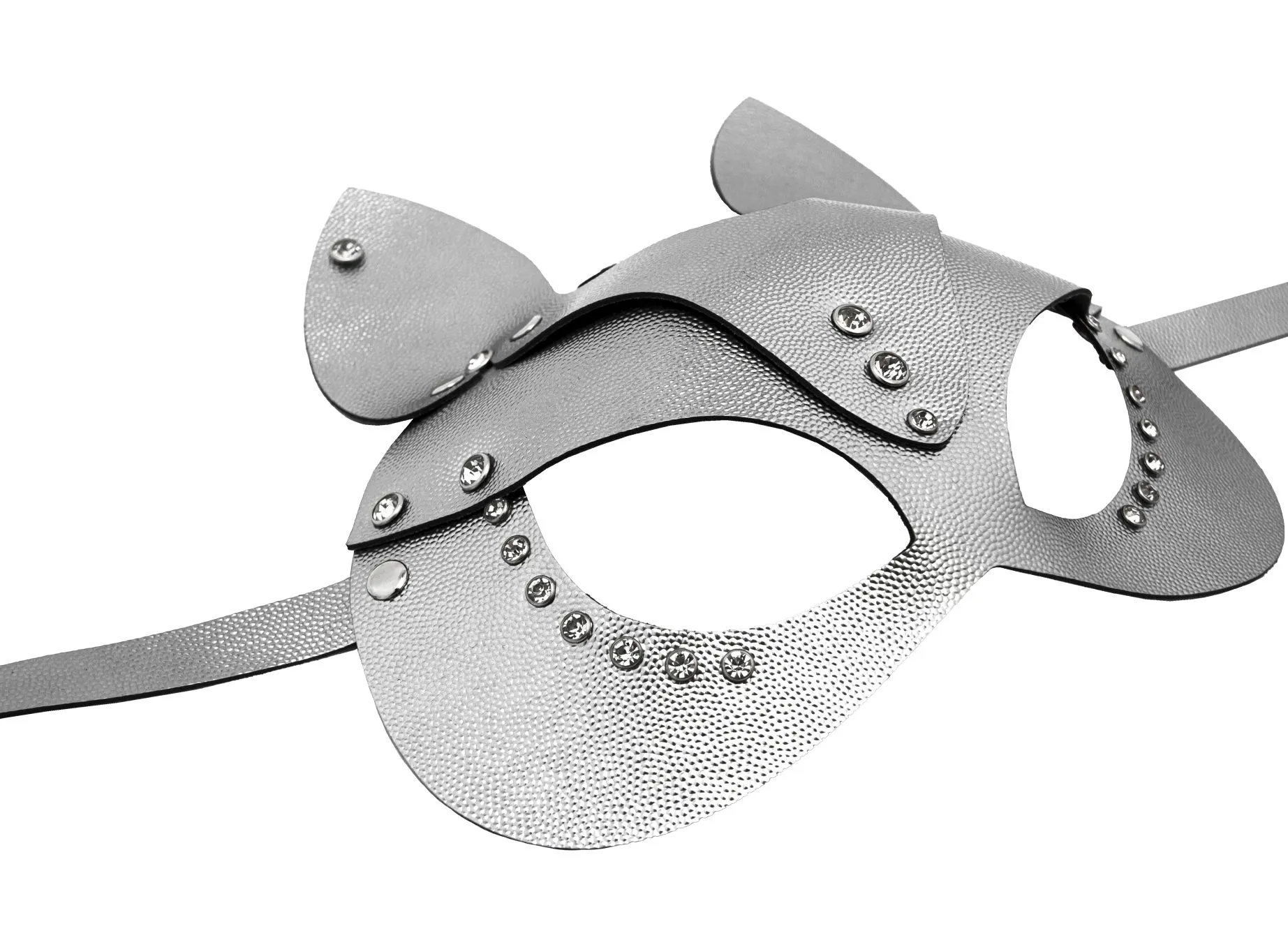 Изящная маска кошки из натуральной кожи черного цвета, украшена стразами. Надевая маску, мы можем дать свободу некоторым своим импульсам, можем их открыть партнёру. В этой маске вы почувствуете себя искусной соблазнительницей, грациозной сексуальной кошечкой и ваш романтический вечер плавно перейдёт в жаркую ночь. Кроме этого, маску можно использовать как карнавальную на различных мероприятиях. При помощи ремешка размер можно регулировать для комфортного ношения.