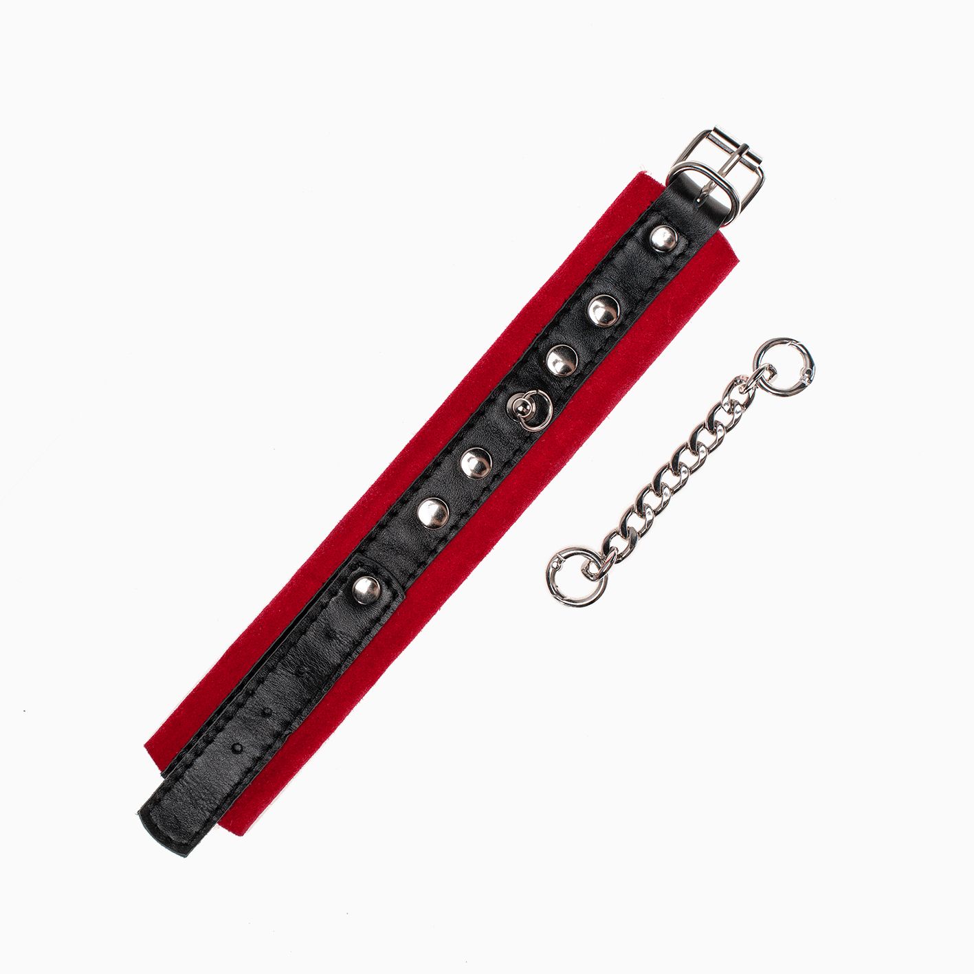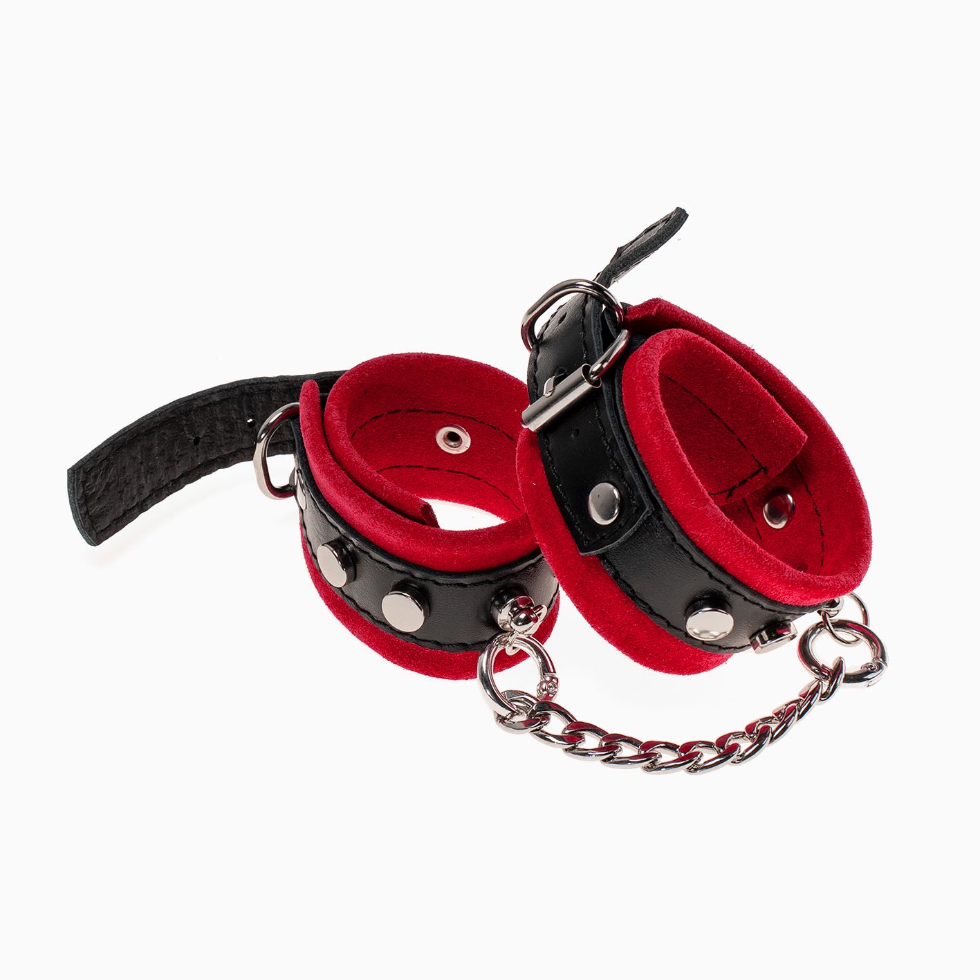 Наручники сделаны из замши и соединены между собой металлической цепочкой на карабинах. Наручники регулируются по размеру ремешками с пряжками.